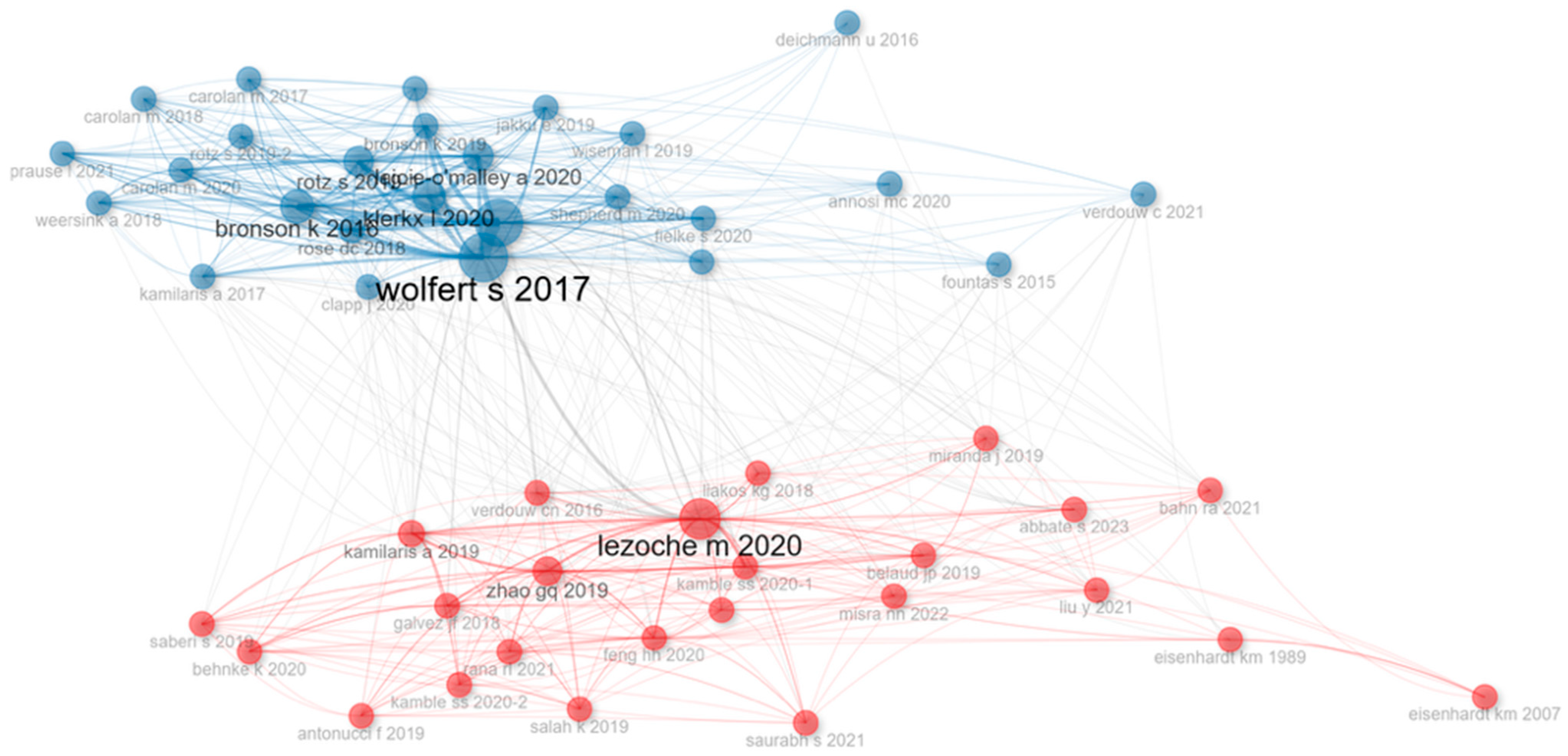 co-citation network that captures the intellectual structure of agri-food digitalization research by mapping the frequency and strength of simultaneous citations among authors. The visualization revealed two distinct clusters, suggesting the existence of divergent but complementary knowledge domains within the field.
