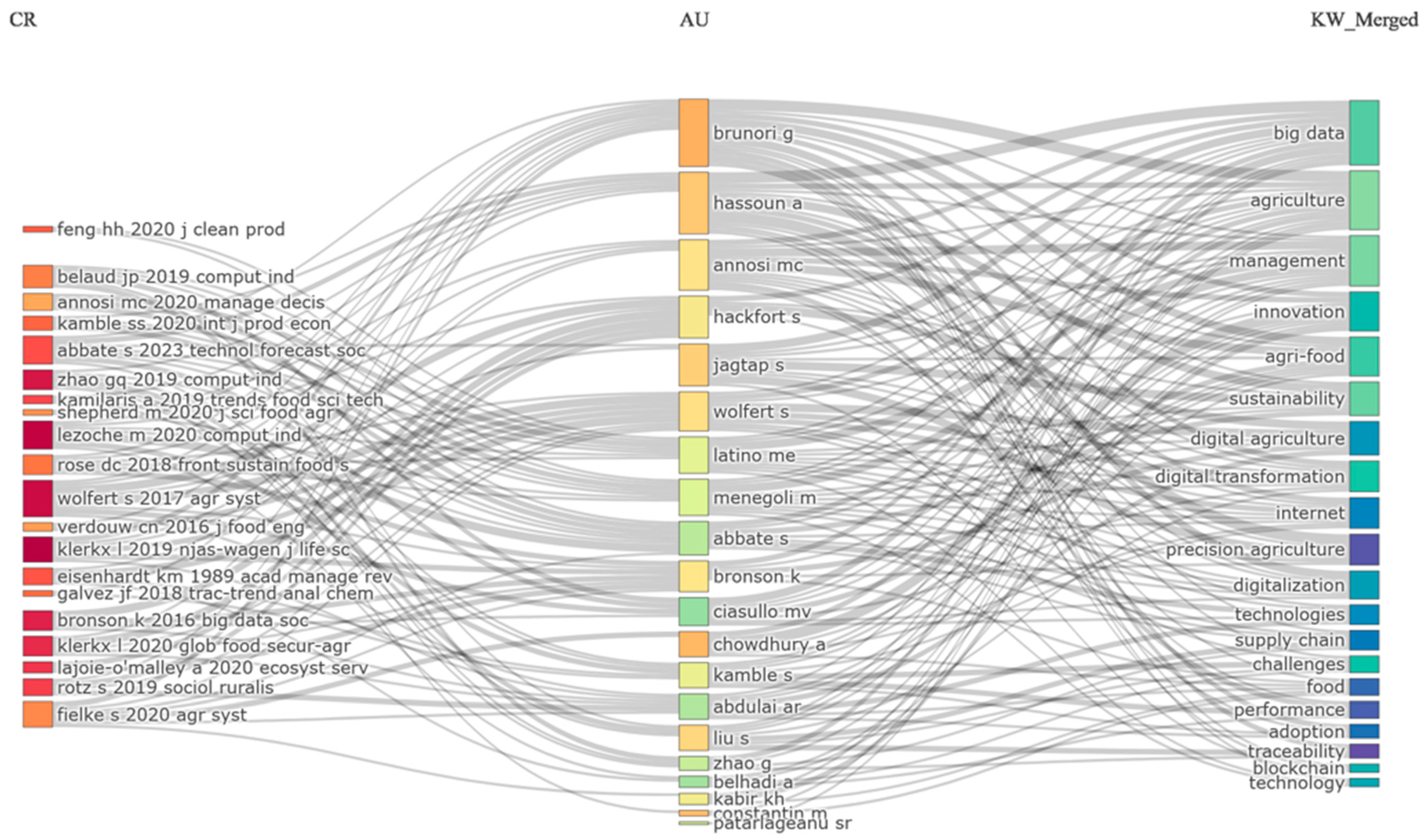 By linking references, authors, and keywords in a single diagram, the figure shows how foundational studies on digital technologies and food-system management feed directly into contemporary research on data-driven agriculture and supply chain innovation. The convergence of multiple authors toward a shared set of keywords indicates the consolidation of a coherent research domain, where digital transformation in agri-food systems is the principal axis connecting prior knowledge, current scholarly activity, and thematic priorities.