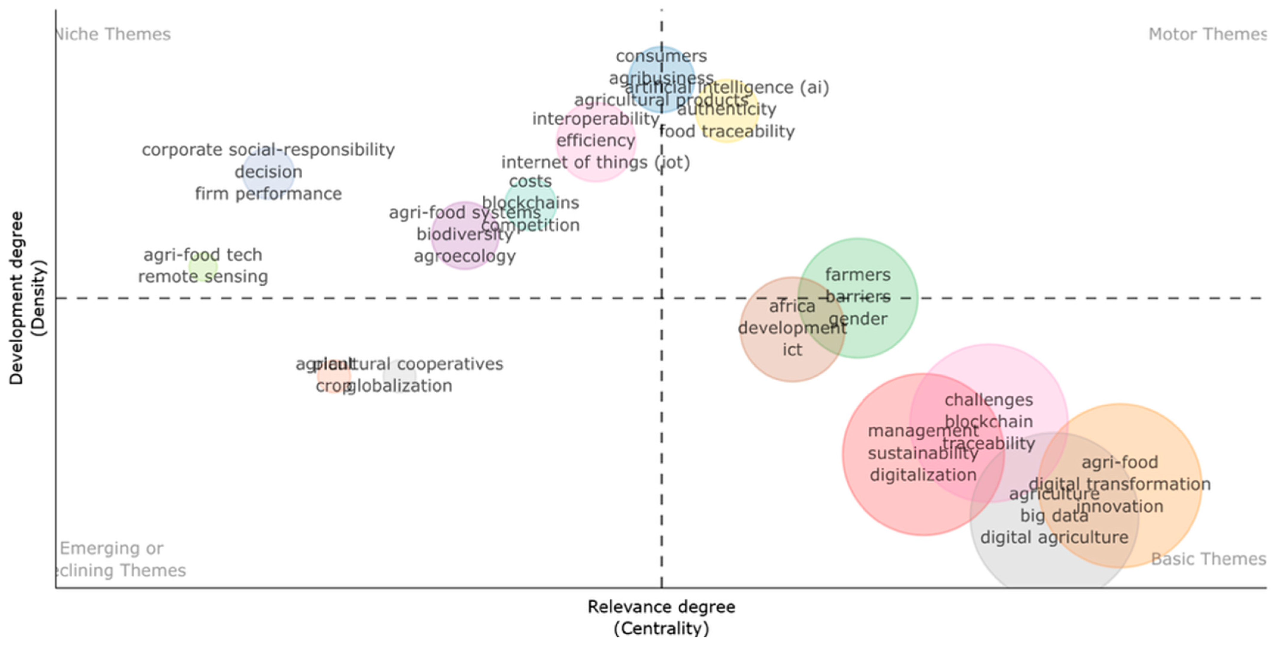 Overall, the thematic map illustrates the multi-layered structure of the agri-food digitalization research field. It underscores the coexistence of mature, central paradigms (e.g., traceability, big data, digital agriculture), rapidly advancing thematic cores (e.g., AI, authenticity), and emerging socially embedded challenges (e.g., gender, ICT in Africa). This distribution reflects a field in transition—where technological sophistication is increasingly accompanied by normative concerns related to governance, participation, and sustainability.