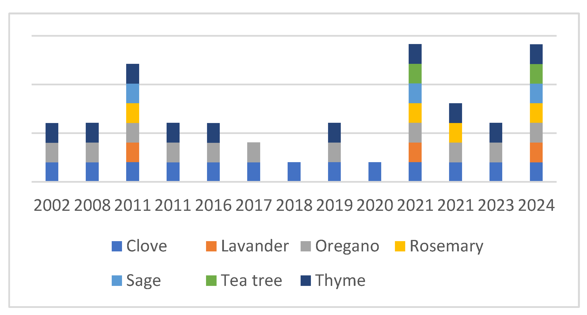 | Thyme (Thymus vulgaris) | Testing whether certain essential oils can inhibit the growth of C. jejuni, a common cause of foodborne illness | Abiotic surface | n.a. | Chicken | n.a. | n.a. | [90] Salem (2019). |
