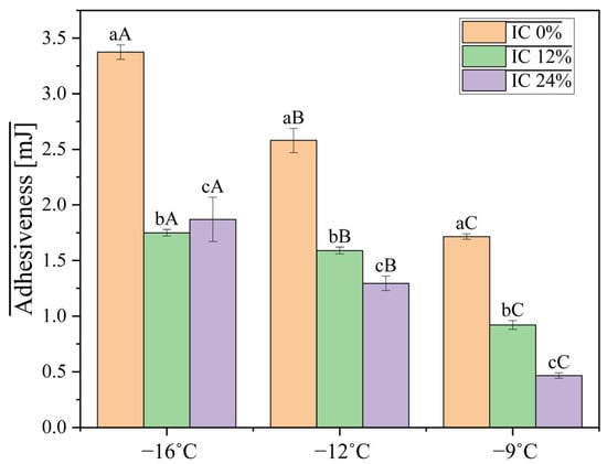 Adhesiveness, shown in Figure 2, is measured as the force required to separate the IC from the surface of the probe. At −16 °C, IC 0% had an adhesiveness of 3.38 ± 0.06 mJ, which is higher than what was registered for IC 12% (1.75 ± 0.03 mJ) and IC 24% (1.87 ± 0.20 mJ). The values also decreased with the decrease in temperature. The inclusion of oleosomes decreased adhesiveness, differing from reports indicating that soybean oleosomes in IC formulations increase adhesiveness [25]. This can be explained by the different botanical sources of the oleosomes, differences in formulations, or the possibility that interactions between oleosomes and the other ingredients in IC affect adhesiveness differently. The concentration of oleosomes likely increases fat-mediated stickiness at different temperatures and reduces adhesiveness at lower temperatures by stabilizing fat droplets, according to the significant interaction (p = 0.008).