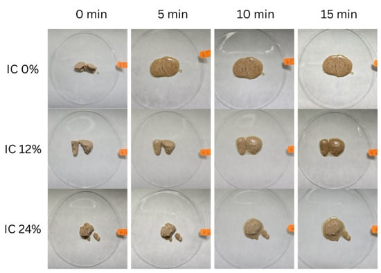 In contrast, sample IC 24%, with the highest oleosome content, had the longest melting time (15 min), suggesting a significant stabilizing effect of these lipid–protein structures. Sample IC 12%, with an intermediate oleosome concentration, melted in 10 min, confirming this trend.