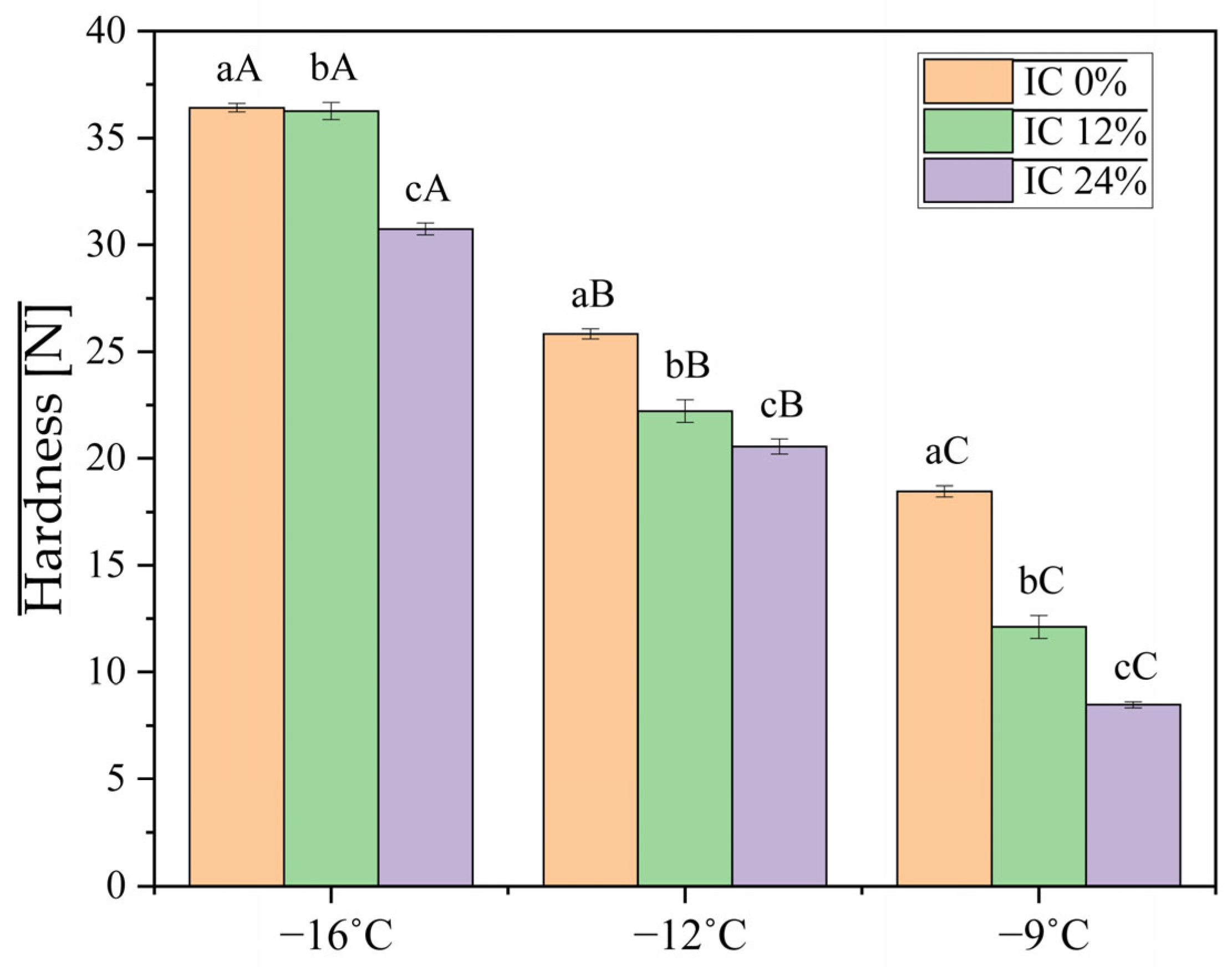 26]. The results obtained from the texture profile analysis (TPA) highlight significant differences between the three formulations. Sample IC 24%, formulated with a high content of oleosomes and, implicitly, vegetable proteins, showed hardness values between 8.48 ± 0.14 N at −9 °C and 30.74 ± 0.28 N at −16 °C, while sample IC 0% recorded hardness values between 18.48 ± 0.26 N at −9 °C and 36.43 ± 0.20 N at −16 °C. These results are consistent with Wang, Wang [