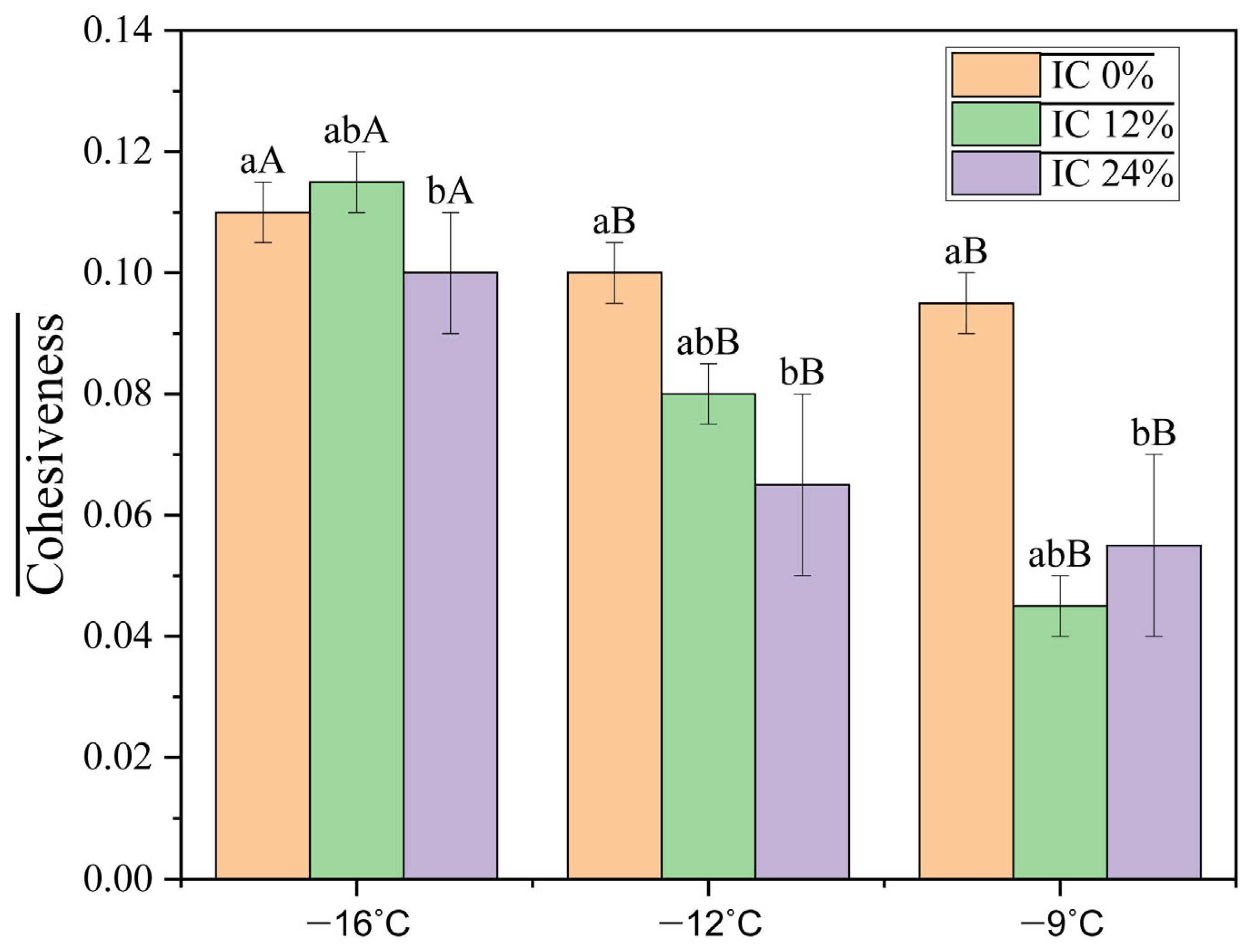 Figure 2, is measured as the force required to separate the IC from the surface of the probe. At −16 °C, IC 0% had an adhesiveness of 3.38 ± 0.06 mJ, which is higher than what was registered for IC 12% (1.75 ± 0.03 mJ) and IC 24% (1.87 ± 0.20 mJ). The values also decreased with the decrease in temperature. The inclusion of oleosomes decreased adhesiveness, differing from reports indicating that soybean oleosomes in IC formulations increase adhesiveness [