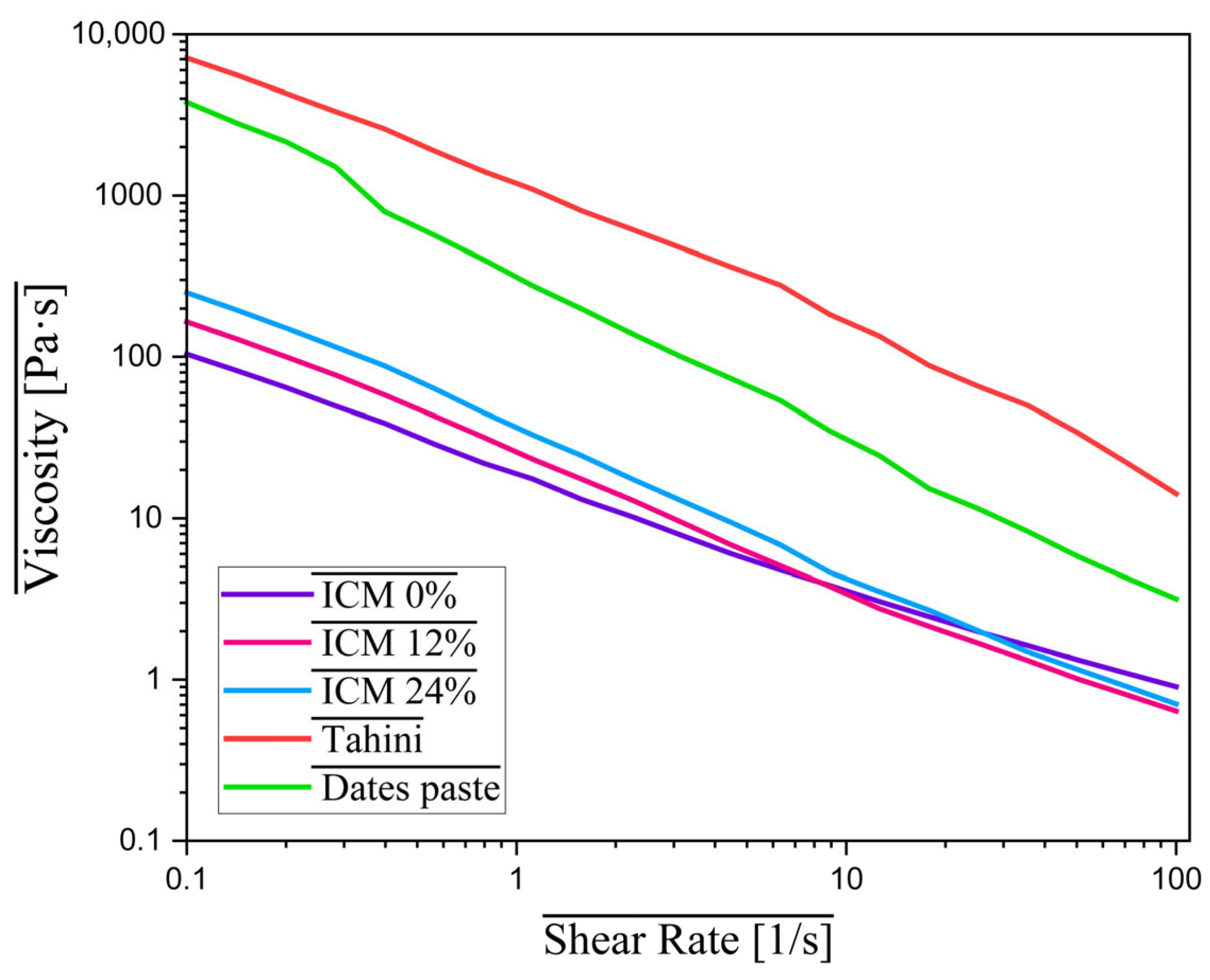 Figure 5, indicating that the date paste had an initial viscosity of 3796.95 Pa·s, decreasing progressively to 3.165 Pa·s as the shear rate increased. Similarly, the tahini had an even higher viscosity at the start of the test, 7119.3 Pa·s, which decreased to 14.20 Pa·s. This behavior reflects an increased concentration of solids and the presence of macromolecular components such as proteins and fibers.