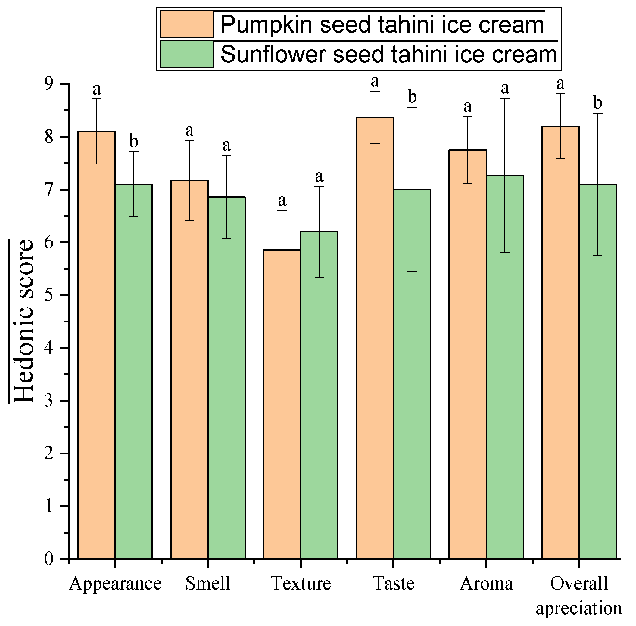 Figure 6, for most attributes: appearance: 8.10 ± 0.62, taste: 8.38 ± 0.49, aroma: 7.76 ± 0.64, and overall appreciation: 8.21 ± 0.62. In contrast, the sunflower tahini sample obtained lower scores for these attributes, especially for taste, 7.00 ± 1.56, and overall appreciation, 7.10 ± 1.35. This contrast suggests a clear preference of the evaluators for the sensory profile offered by pumpkin tahini.