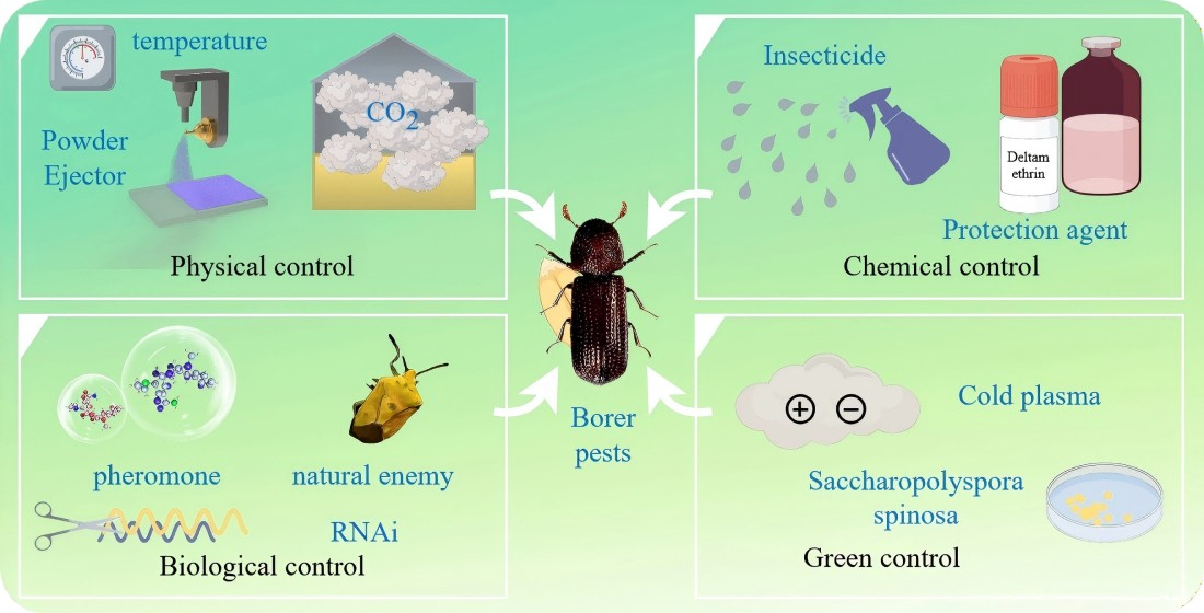 To ensure food and grain safety, various technologies (physical, chemical, and biological methods) are employed to control stored-product borers. Physical methods mainly encompass preventing and controlling the presence of pests through temperature regulation, atmosphere adjustment, ionizing radiation, and inert powdering. Chemical methods include fumigants, protectants, and green plant essential oils. Biological approaches utilize natural enemies, pathogens, pheromones, growth regulators, and gene interference. However, the control of borers faces challenges such as pest resistance and pesticide residues. Consequently, researchers are actively exploring green, ecological, and sustainable strategies to mitigate these food safety risks.