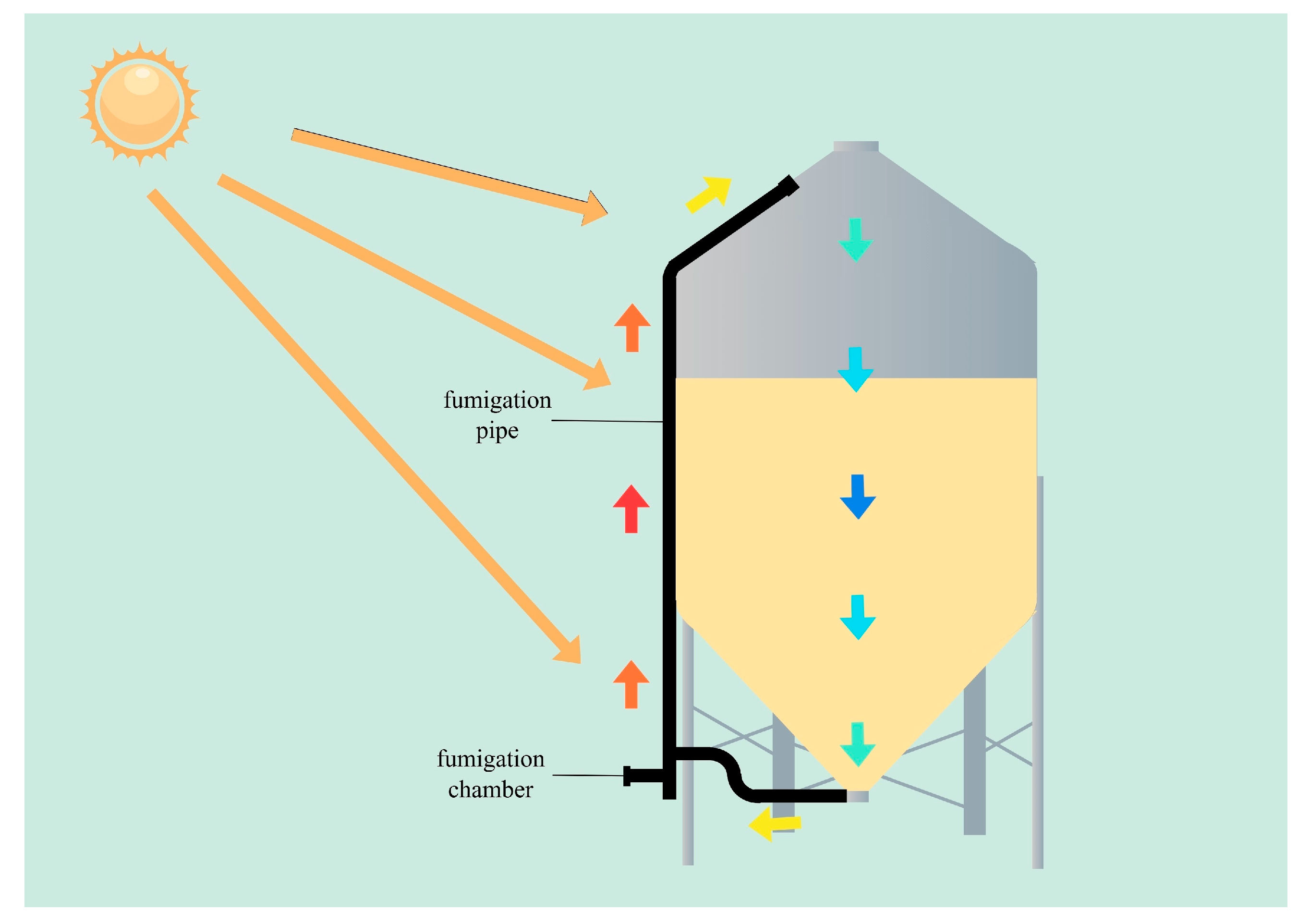 - Doran, G.S. The effectiveness of phosphine fumigation of wheat in a farm-scale thermosyphon silo. J. Stored Prod. Res. 2024, 109, 102414. [Google Scholar] [CrossRef]