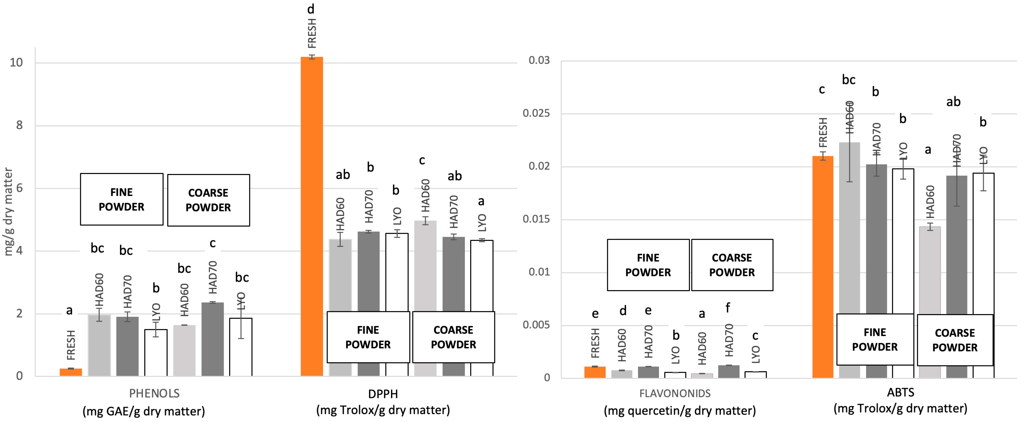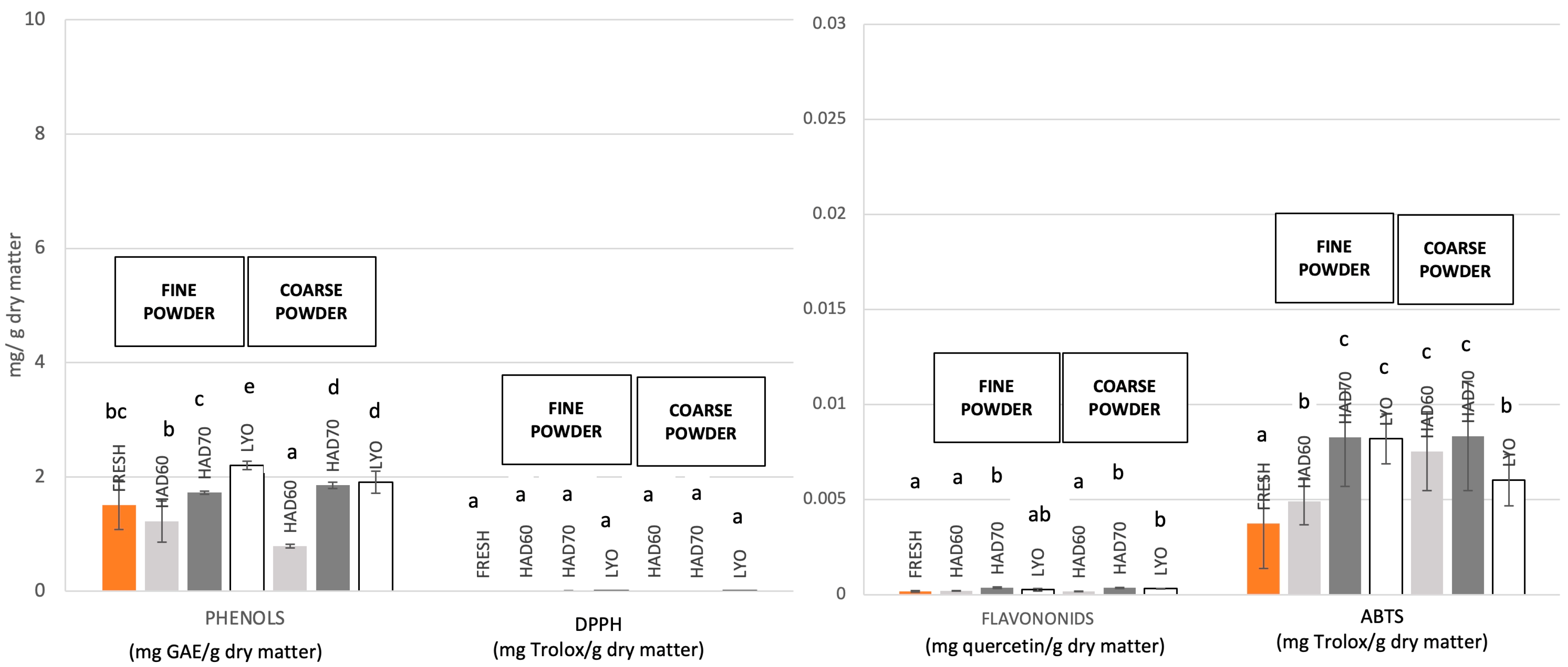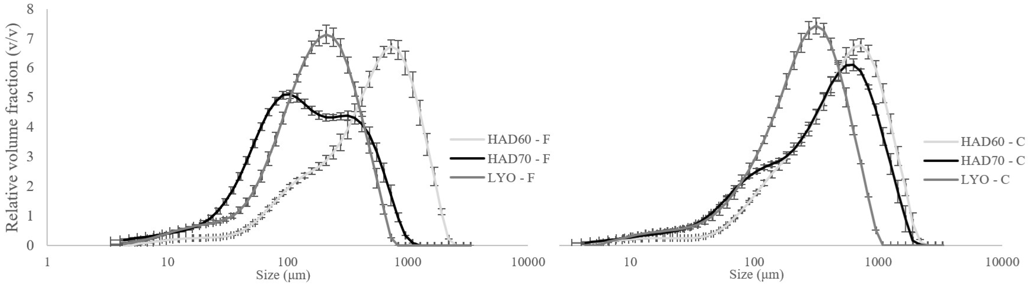 3.1. Physicochemical and Antioxidant Properties of Persimmon Powders: Effect of Drying Method and Particle Size