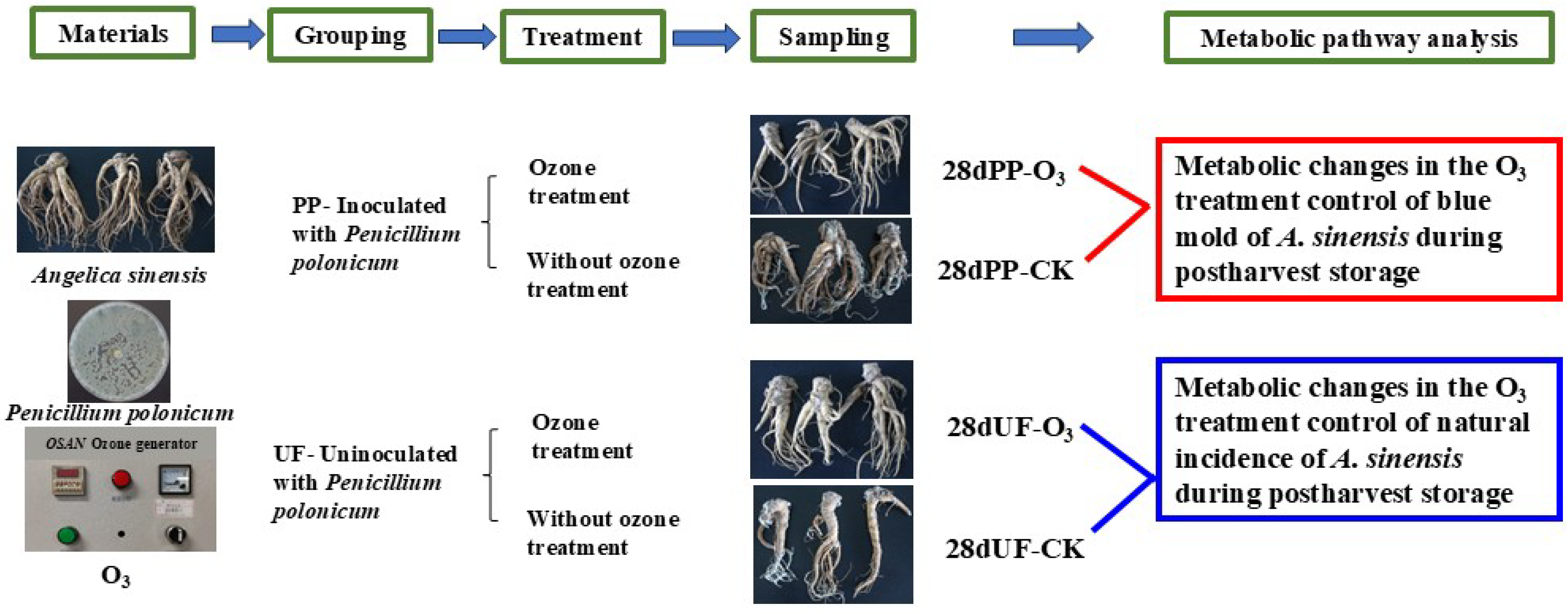 Xi, J.; Jiang, K.; Xue, H.; Bi, Y. Non-Targeted Metabolomics Analysis Reveals the Inhibition Mechanism of Ozone Treatment on Postharvest Blue Mold in Angelica sinensis. Foods 2026, 15, 493. https://doi.org/10.3390/foods15030493