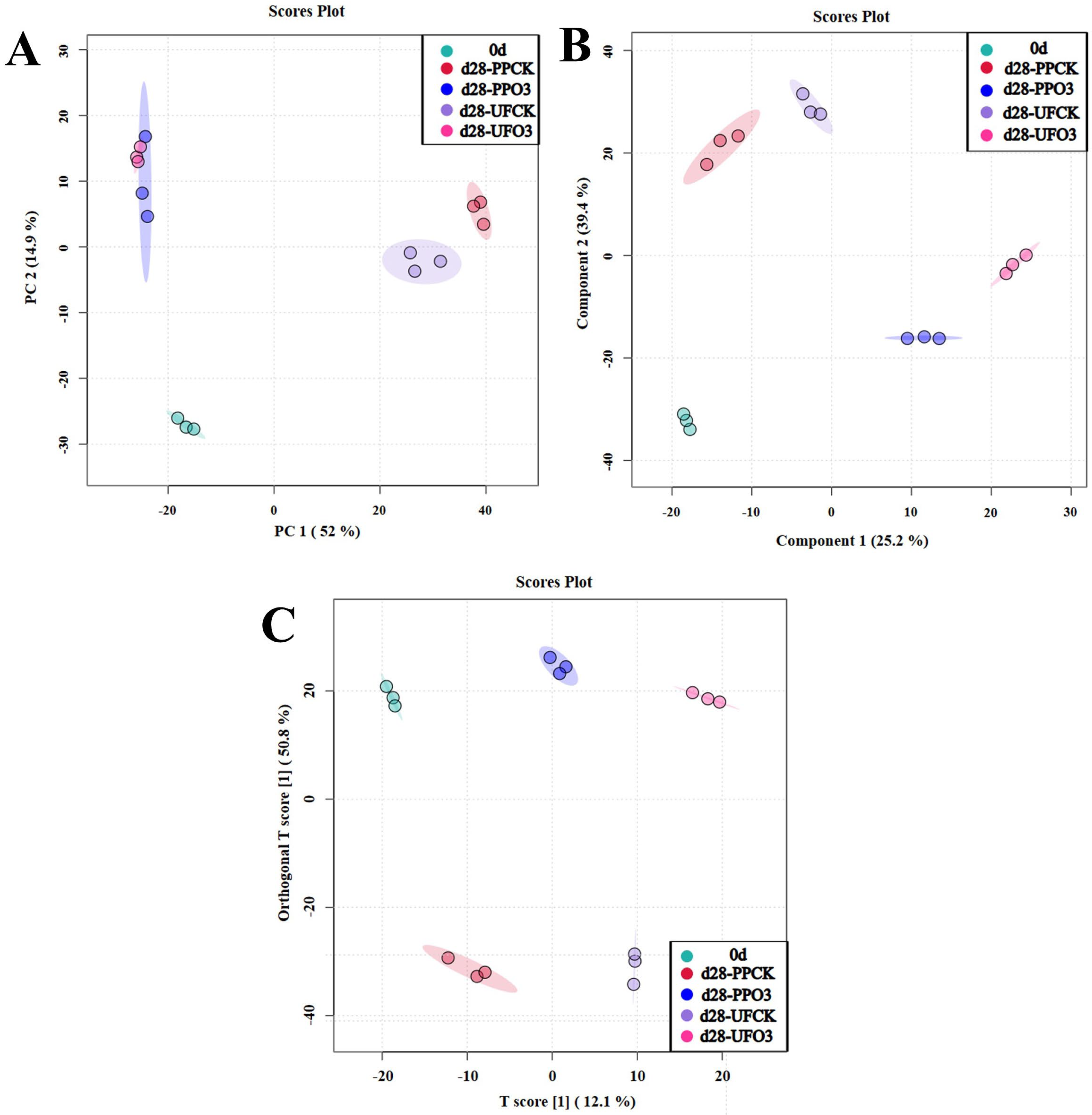 3.2.1. PCA, PLS-DA and OPLS-DA Analyses
