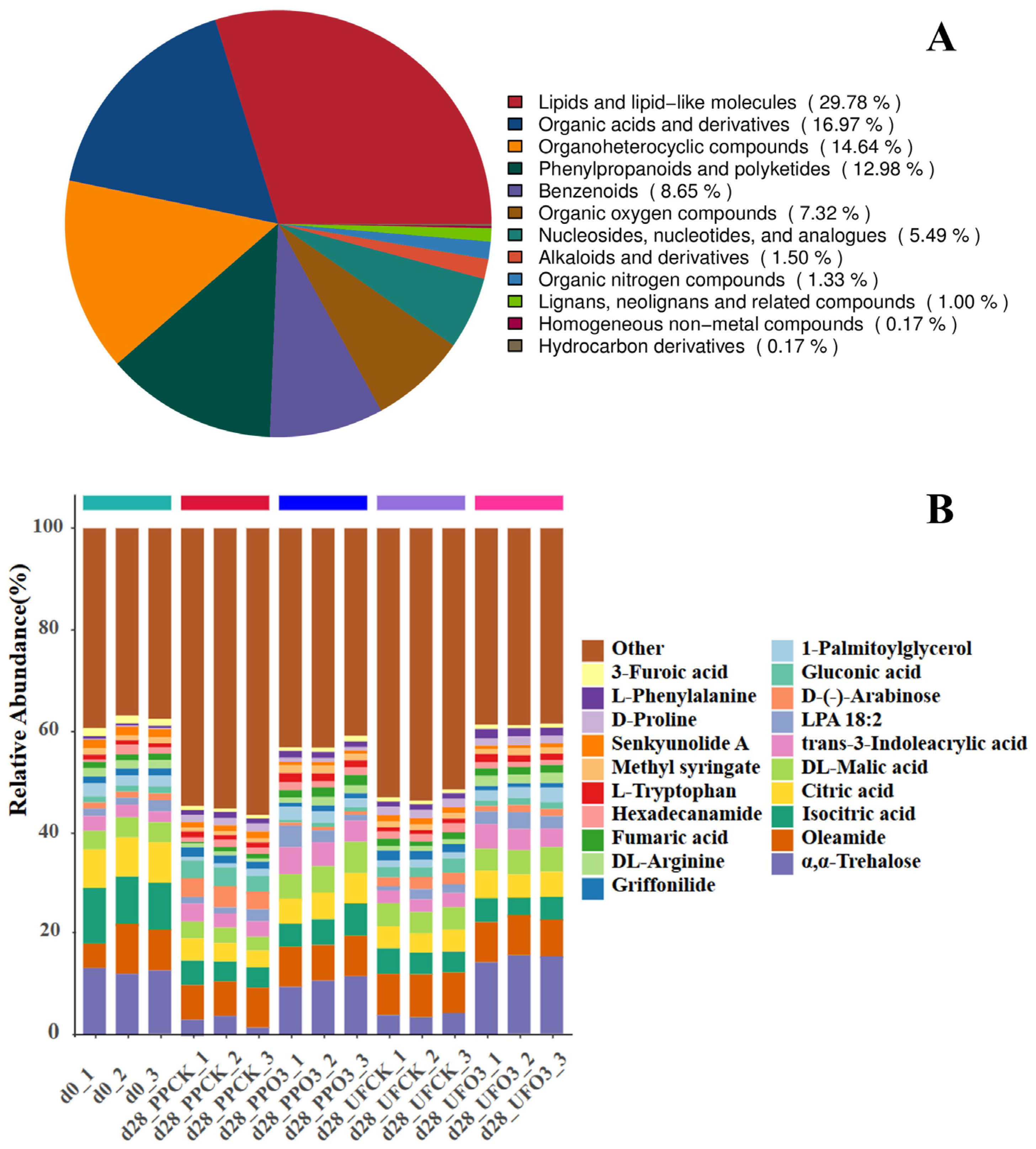 indicates that L-serine was not significantly enriched in the d28PPO3-vs-d28PPCK comparison group and up-regulated to accumulate in the d28UFO3-vs.-d28UFCK comparison group). (The identification data for the core metabolites shown in the figure are derived from Table S5).