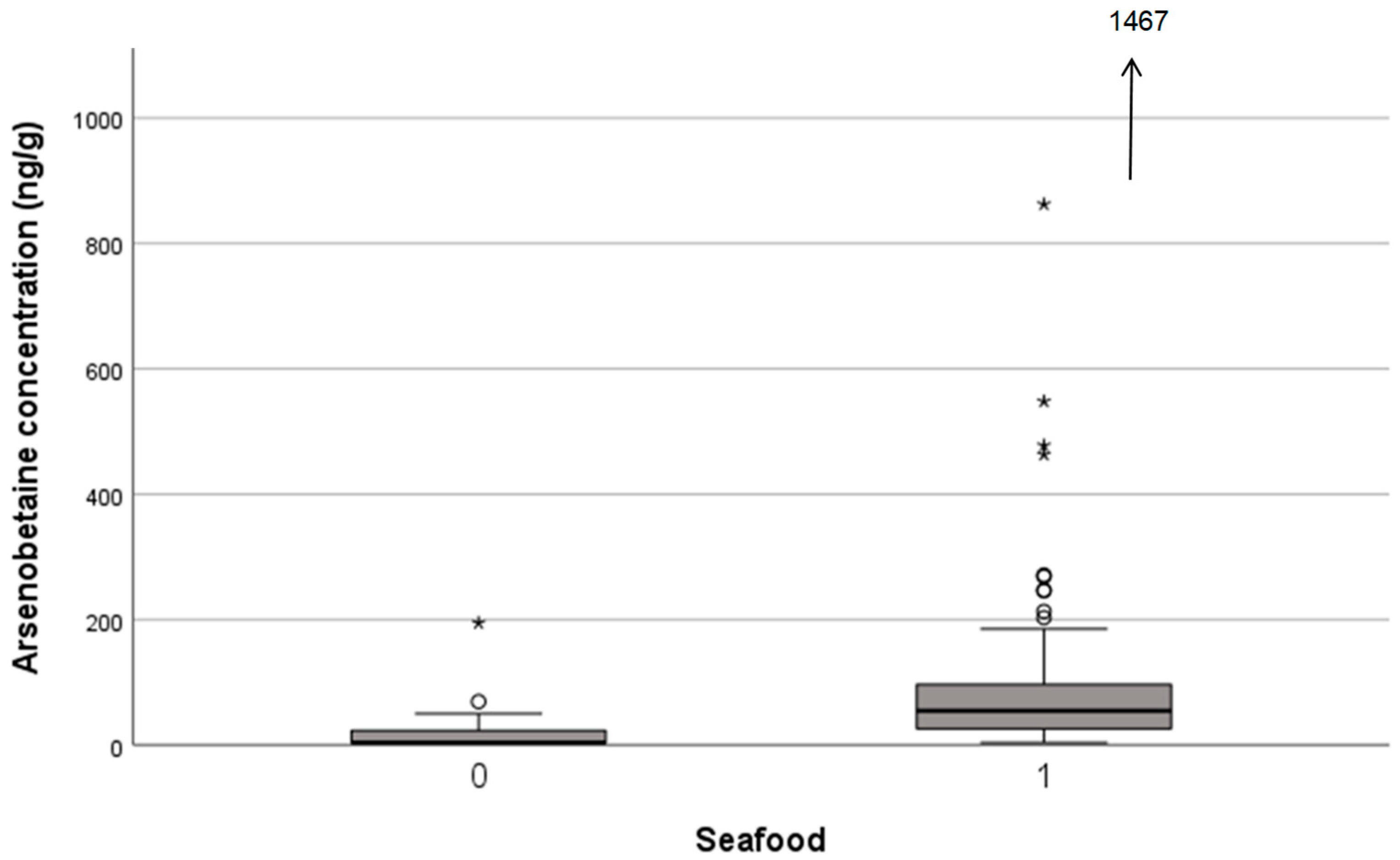 - Yoshinaga, J.; Narukawa, T. Dietary intake and urinary excretion of methylated arsenicals of Japanese adults consuming marine foods and rice. Food Addit. Contam. 2021, 38, 622–629. [Google Scholar] [CrossRef]