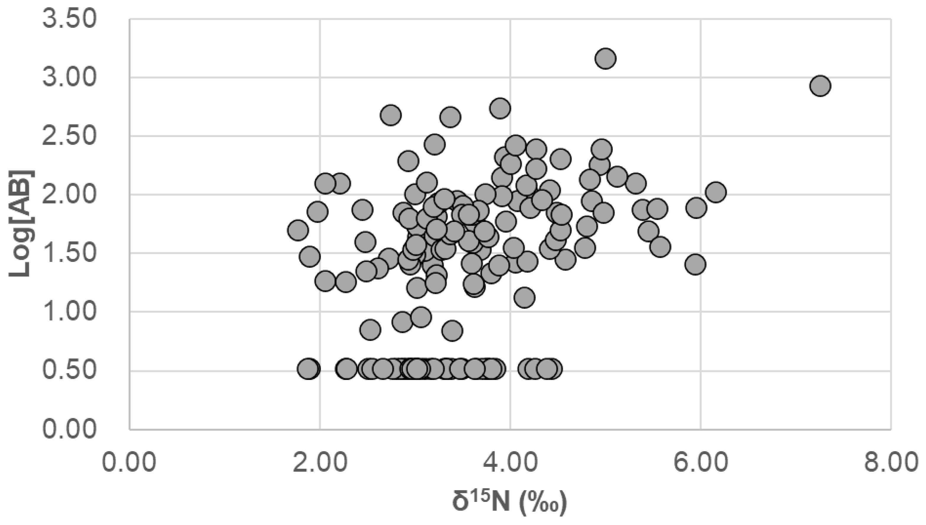 - Steele, K.W.; Daniel, R.M. Fractionation of nitrogen isotopes by animals—A further compilation to use of variations in natural abundance of N-15 for tracer studies. J. Agric. Sci. 1978, 90, 7–9. [Google Scholar] [CrossRef]