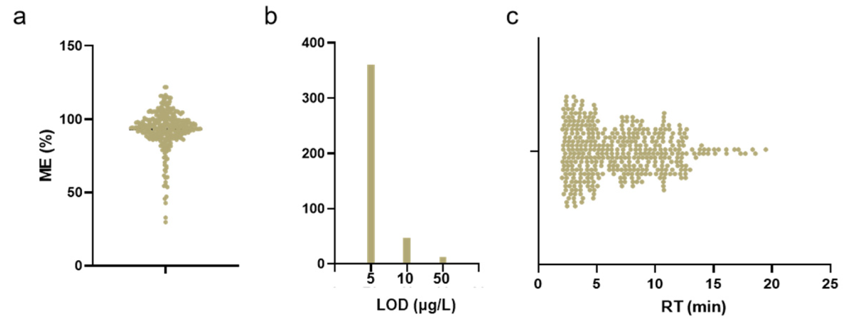 36] guidelines for qualitative screening methods, the validation assessed the SDL and accuracy. It is explicitly noted in the guideline that analyte recovery is not a requirement under such a context. To uphold a more comprehensive standard of scientific rigor, we voluntarily included an assessment of other critical validation metrics, namely the LOD, precision, ME, and stability.