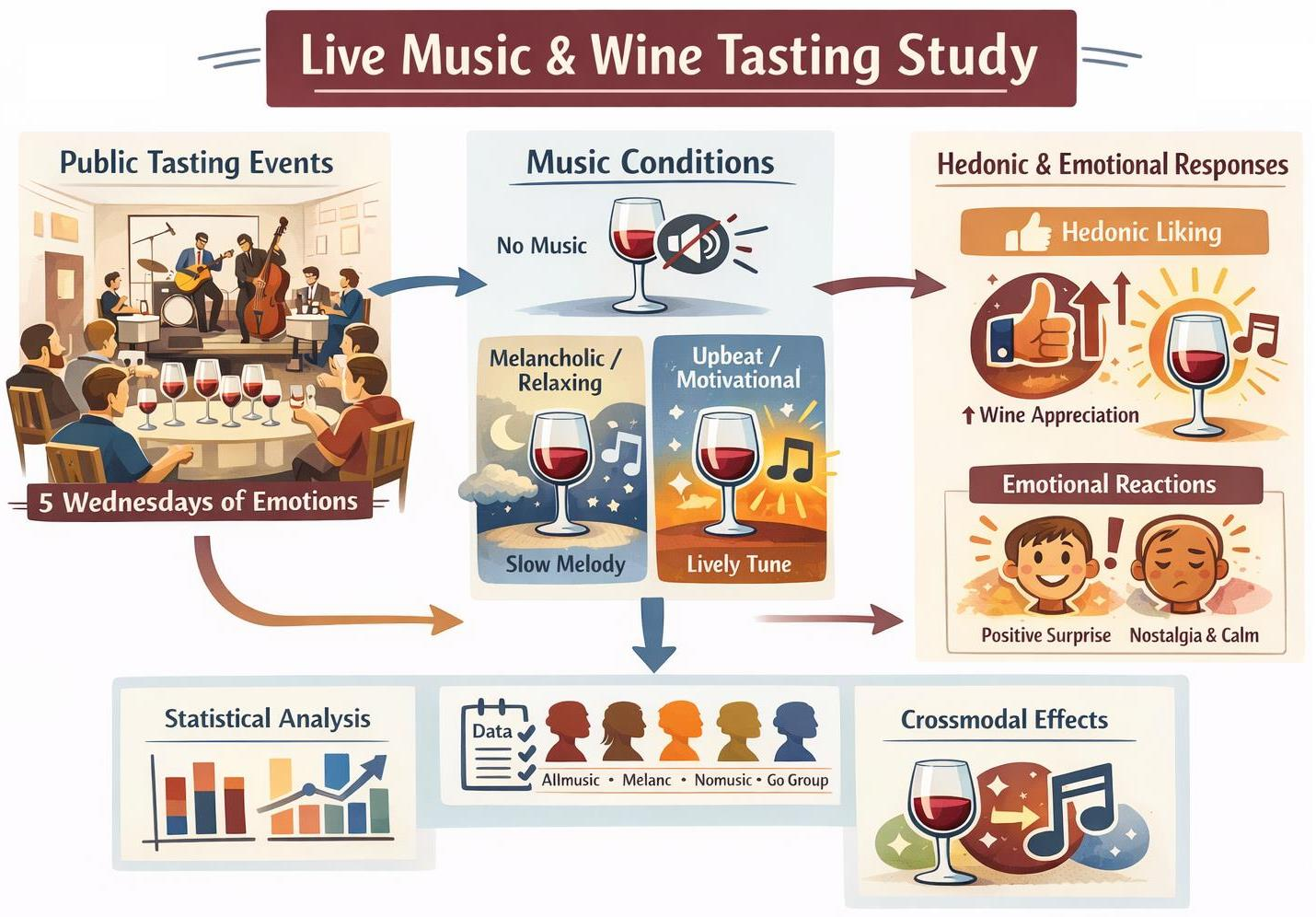 In the wider frame of the research project “Cantina 5.0” [34], the present study investigates how musical atmospheres influence hedonic wine evaluations and emotional profiles during five distinct events belonging to a public tasting series titled “5 Wednesdays of Emotions.” Each event included a blind tasting of four different wines (one of which remained constant throughout the five events, to give us a standard reference point). The music was performed live by a jazz trio, whose members varied from one event to the next. For each wine, two songs were selected from a very wide jazz catalogue, to evoke contrasting emotional states: a melancholic/relaxing song (mel) and an upbeat/motivational song (upb). The order by which mel and upb songs were played was random for each wine, to avoid a drift in the music-induced emotions. Spectators were asked to complete an online survey in which they evaluated several emotional variables and provided an overall hedonic judgment. The latter was recorded three times: first in the absence of music, then while listening to the first song, and finally during the second song. We analyzed whether music modulates liking, whether the magnitude of this modulation differs between songs, and how emotional responses relate to hedonic outcomes. We further tested potential confounders such as tasting order, wine identity, and individual traits (gender, age, body type, wine experience, music experience).