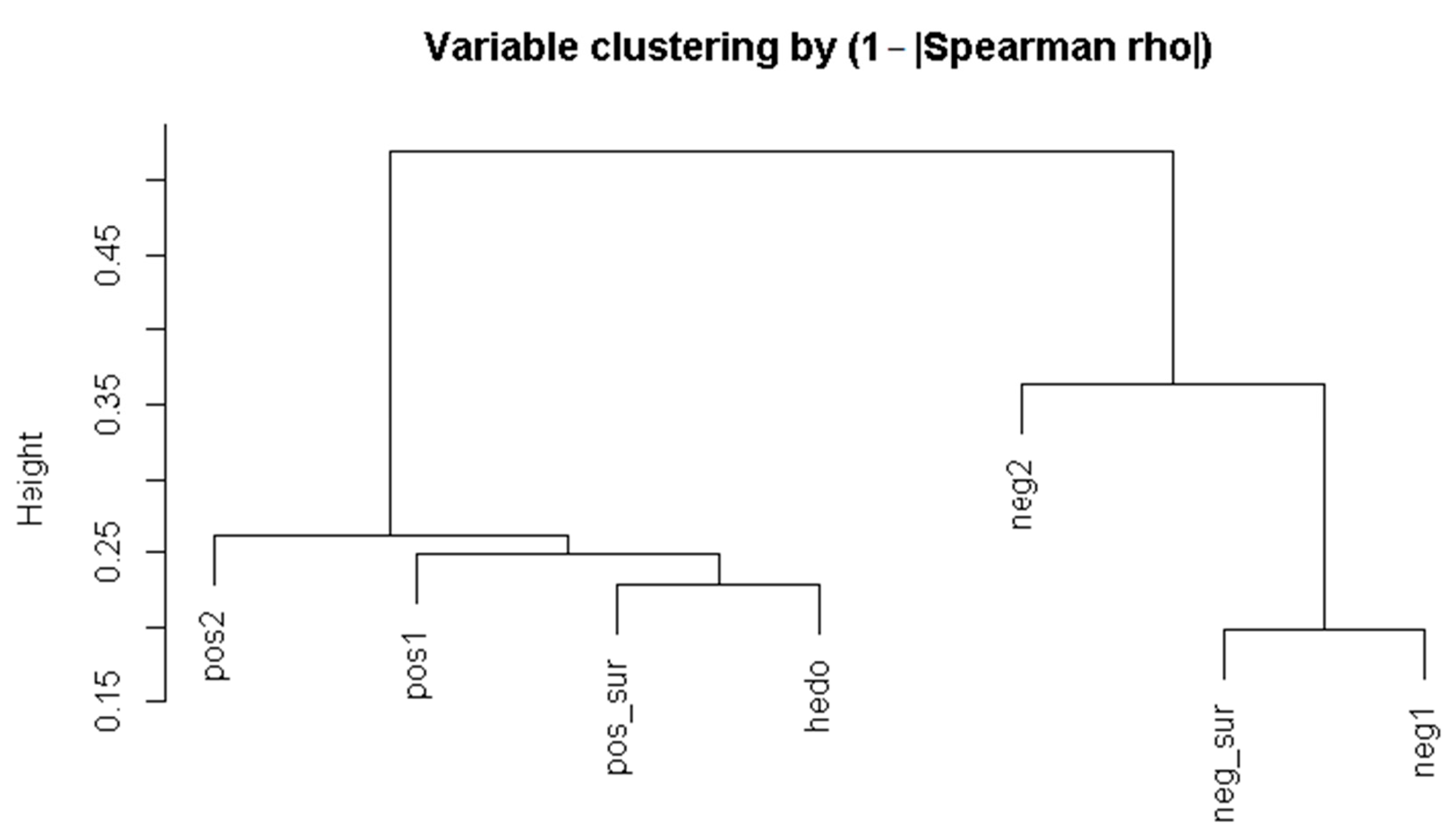 Figure 2. The dendrogram obtained by a hierarchical clustering of emotional variables, based on 1 − |rho-index|.