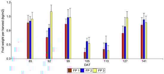 Bell pepper fruit yield across seven harvests according to fertigation program under greenhouse conditions. DAT: days after transplanting; FP1: Fertigation Program 1; FP2: Fertigation Program 2: FP3: Fertigation Program 3 (see Table 1).