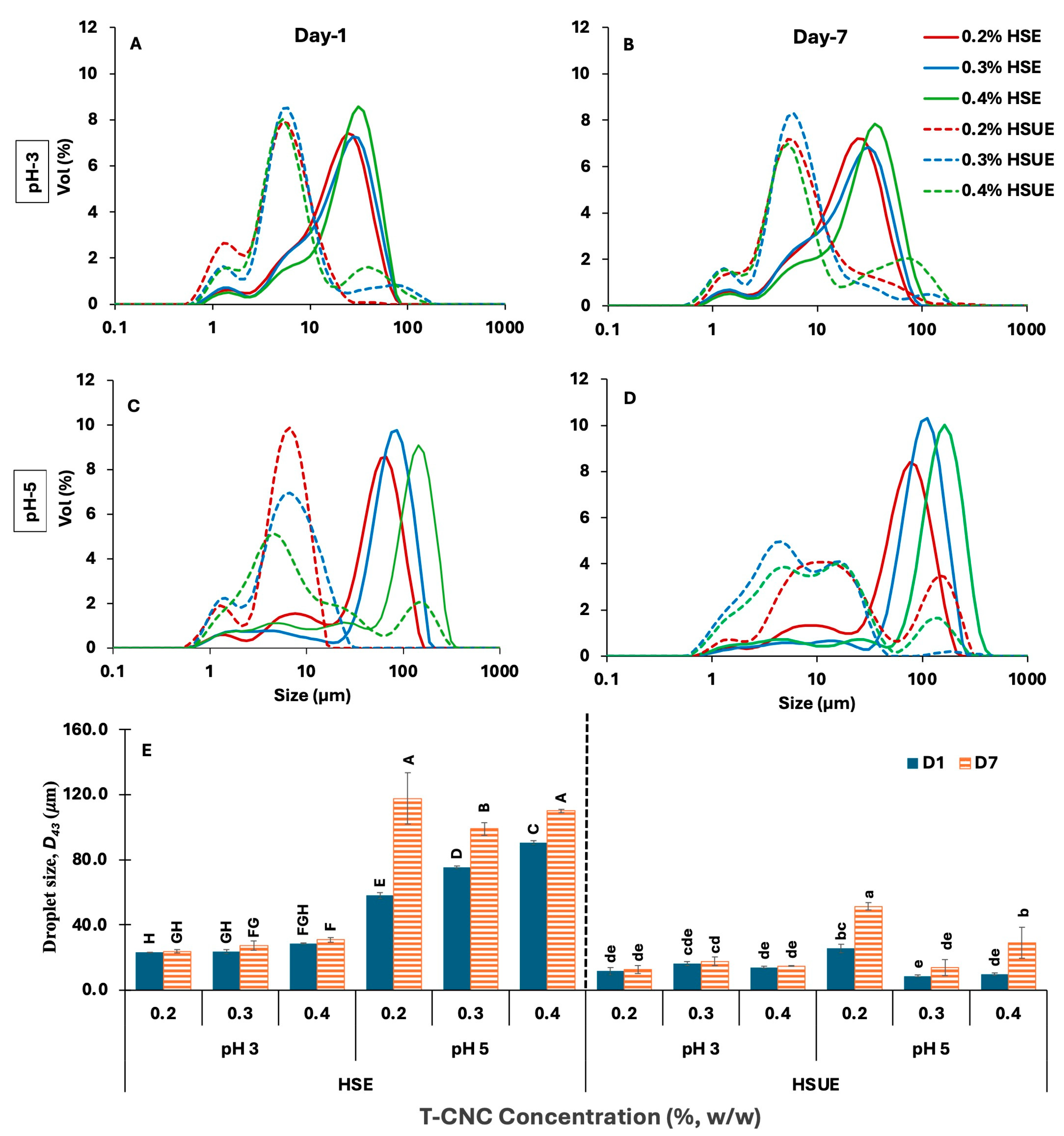 3.2.1. Droplet Size of T-CNC-Stabilized PEs