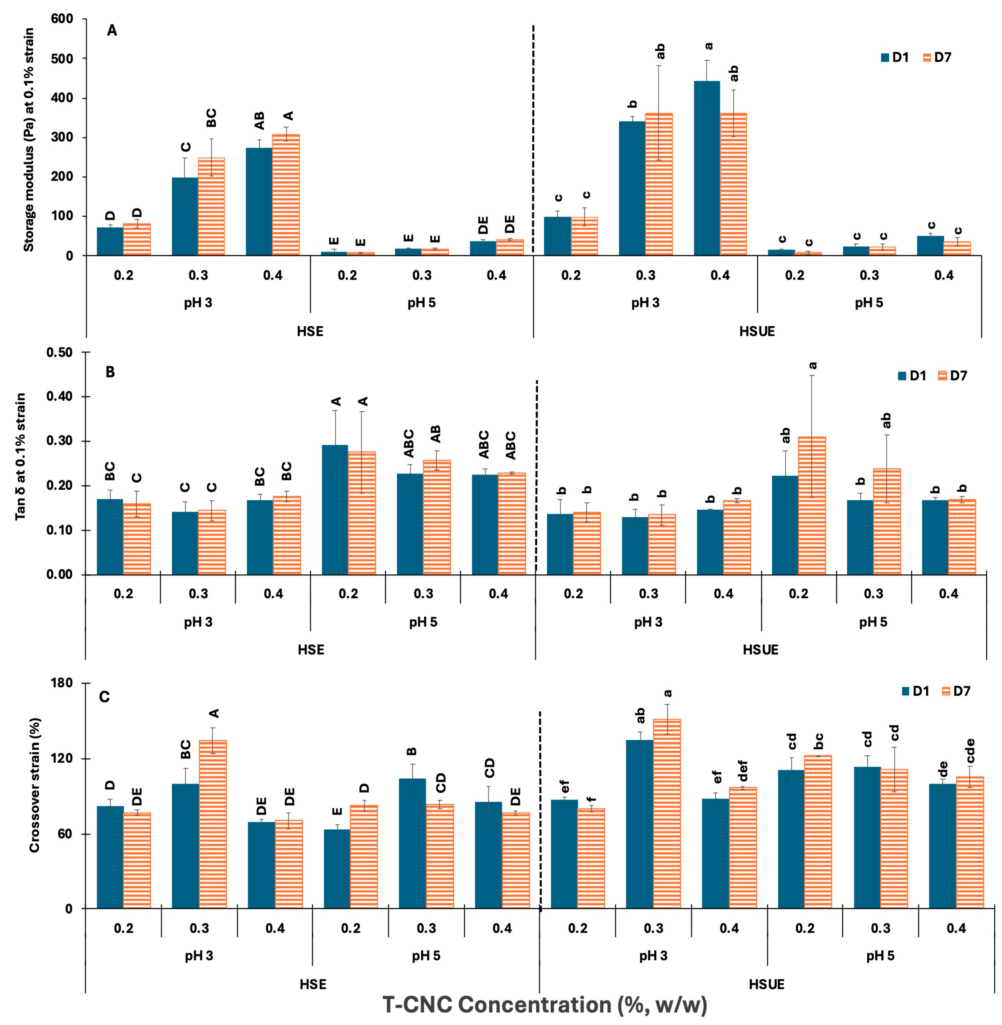 Comparison of Storage Moduli, Tan δ and Viscoelastic Crossover Strain of T-CNC-Stabilized PEs