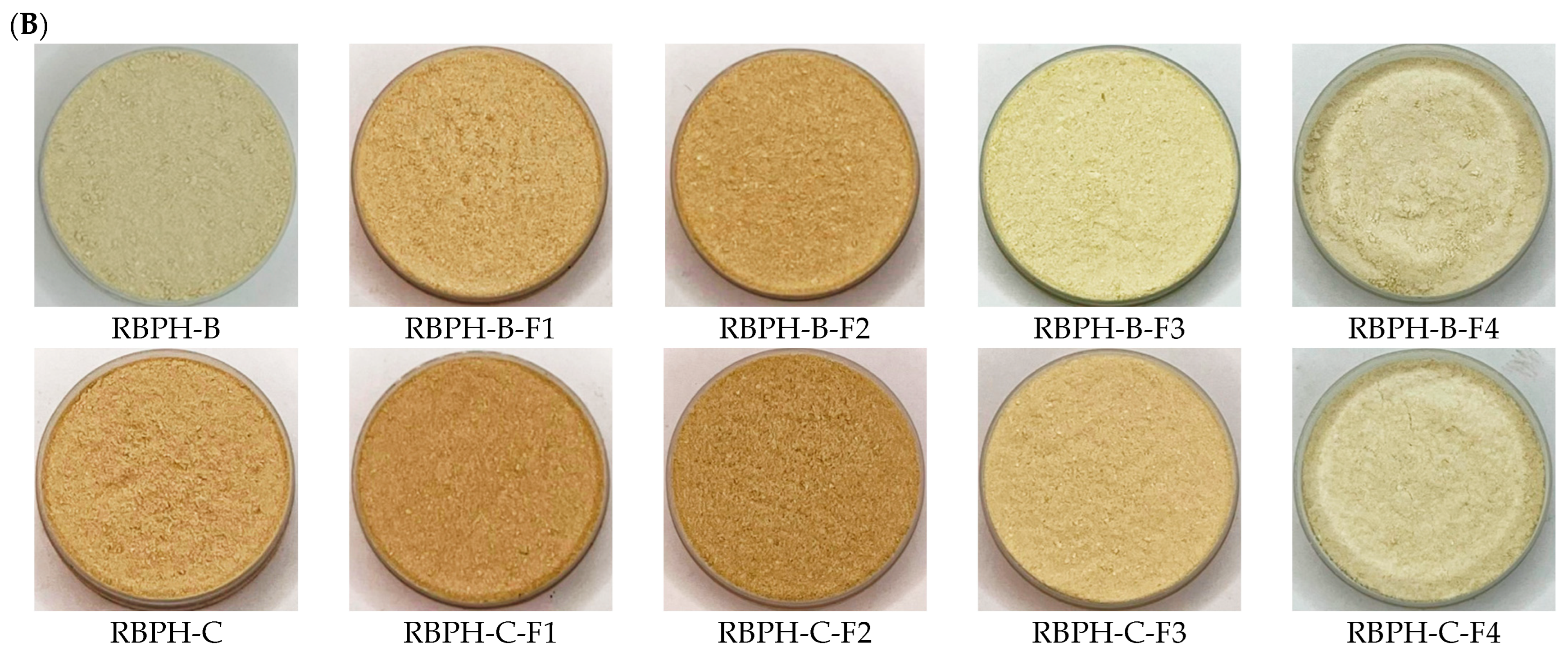 | RBPH-C-F3 | 81.29 ± 0.07 bB | −0.60 ± 0.16 cE | 14.95 ± 0.04 aE | 27.67 ± 0.10 bB |