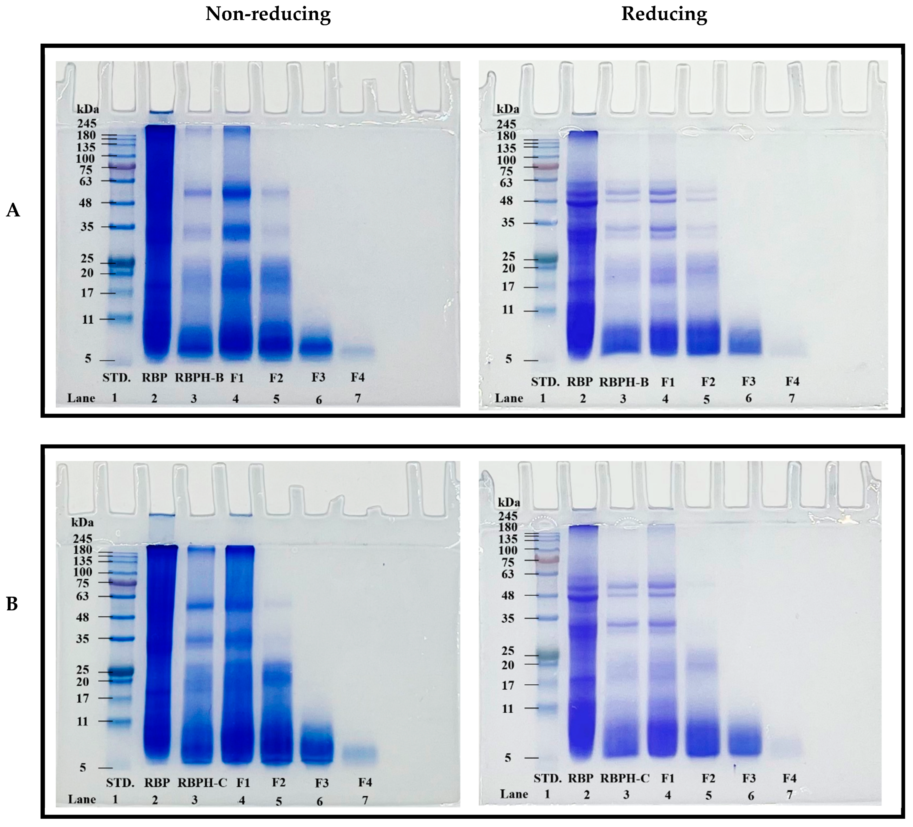 3.1. Characteristics of Rice Bran Protein, Rice Bran Hydrolysates, and Peptide Fractions
