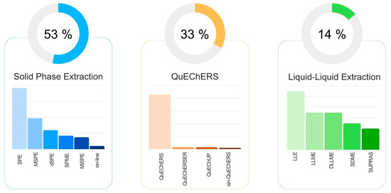 The sample preparation process, particularly the extraction step, is crucial for the removal of matrix interferences, as well as the isolation and concentration of analytes to ensure high-quality measurements [112,113]. Various techniques are available for sample preparation mediated by a sorbent or a solvent. A survey of literature published between 2020 and 2025 regarding the determination of exogenous toxic compounds in food analysis by LC-MS/MS, as indexed in Scopus, shows (Figure 2) that solid-phase extraction is the predominant technique, applied in approximately 53% of the reviewed publications. QuEChERS is utilized in 33% of cases, while liquid–liquid extraction is performed in only 14% of the studies examined.