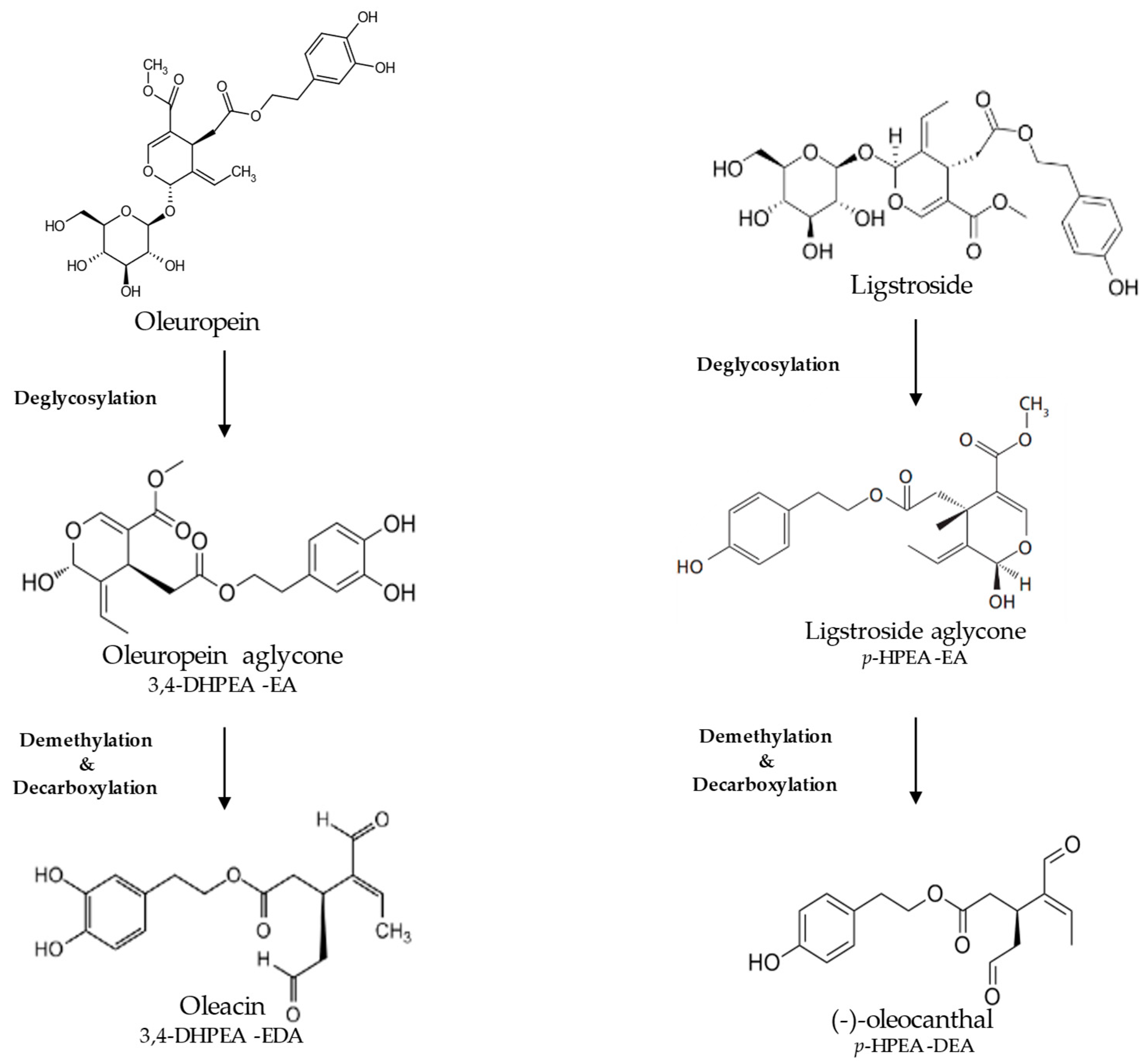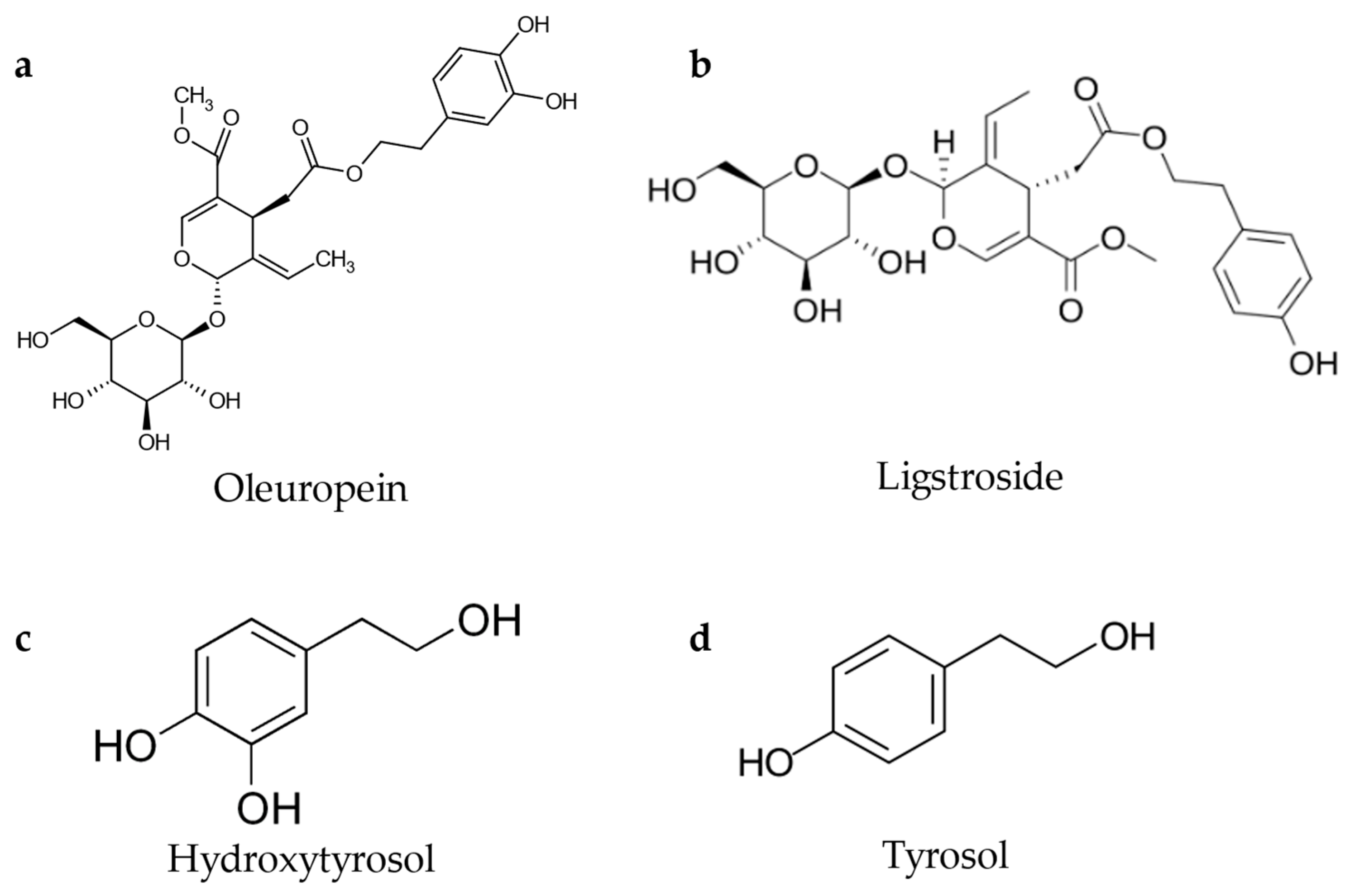 - Filardo, S.; Mattioli, R.; Di Risola, D.; Mosca, L.; Di Pietro, M.; Sessa, R. Olea europaea L-derived secoiridoids: Beneficial health effects and potential therapeutic approaches. Pharmacol. Ther. 2024, 254, 108595. [Google Scholar] [CrossRef] [PubMed]