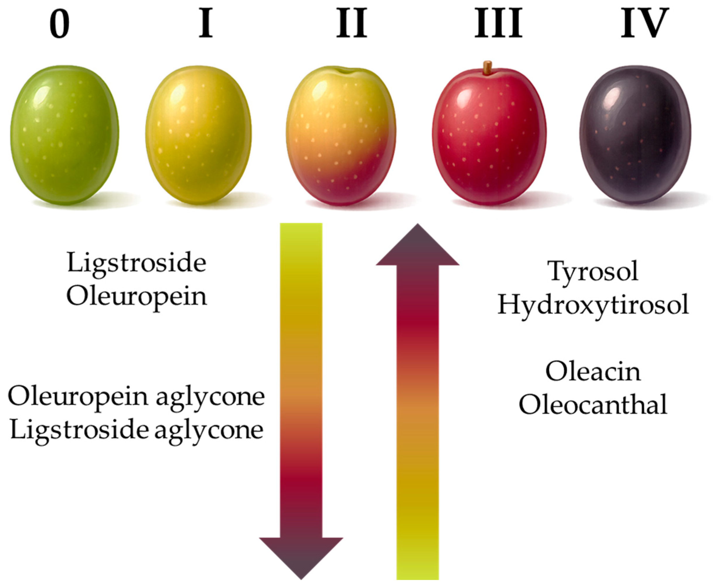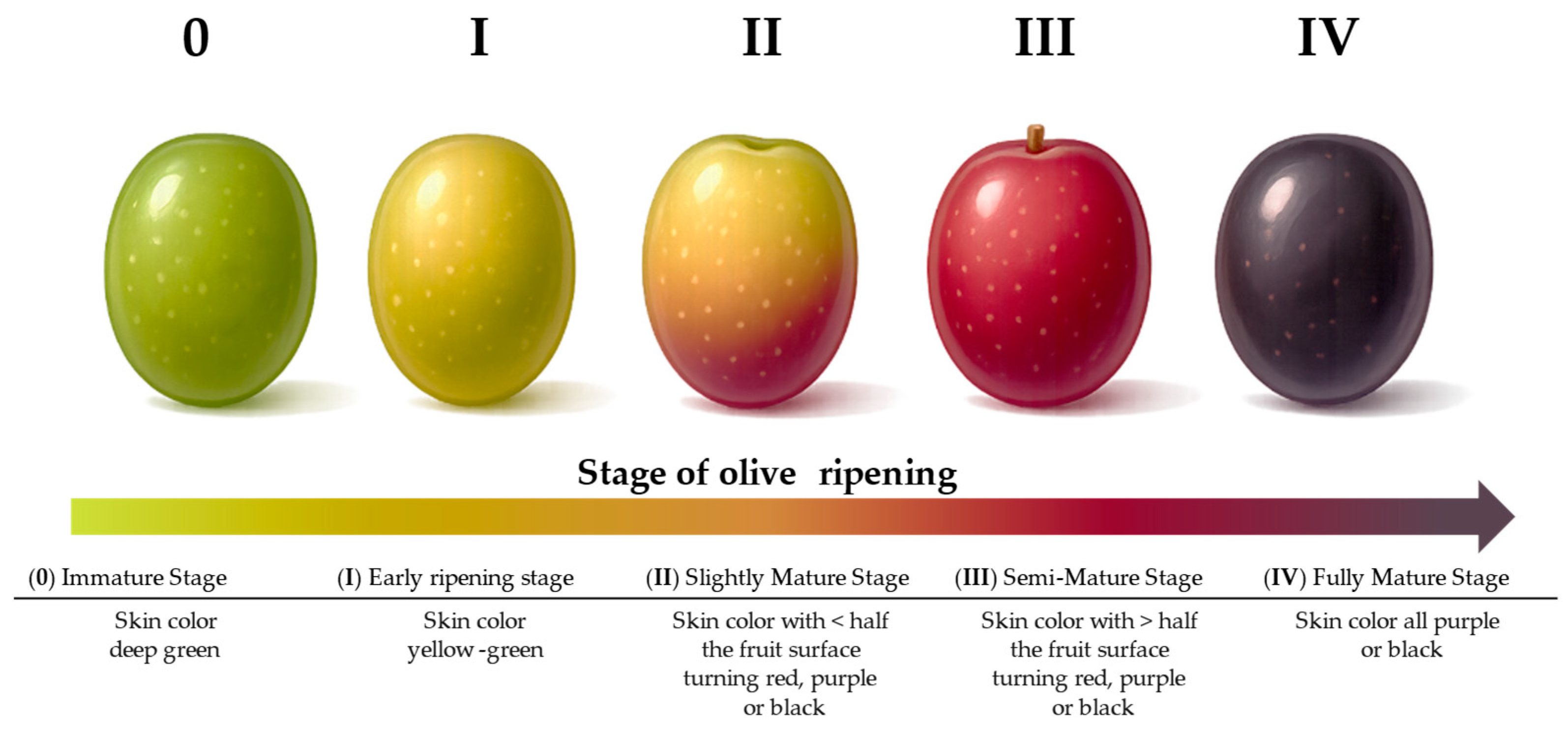 - Vicario, G.; Cantini, C.; Francini, A.; Raffaelli, A.; Cifelli, M.; Domenici, V.; Sebastiani, L. Olive Fruit Ripening Degree and Water Content Relationships with Phenolic Acids and Alcohols, Secoiridoids, Flavonoids and Pigments in Fruit and Oil. Molecules 2023, 28, 6943. [Google Scholar] [CrossRef]
