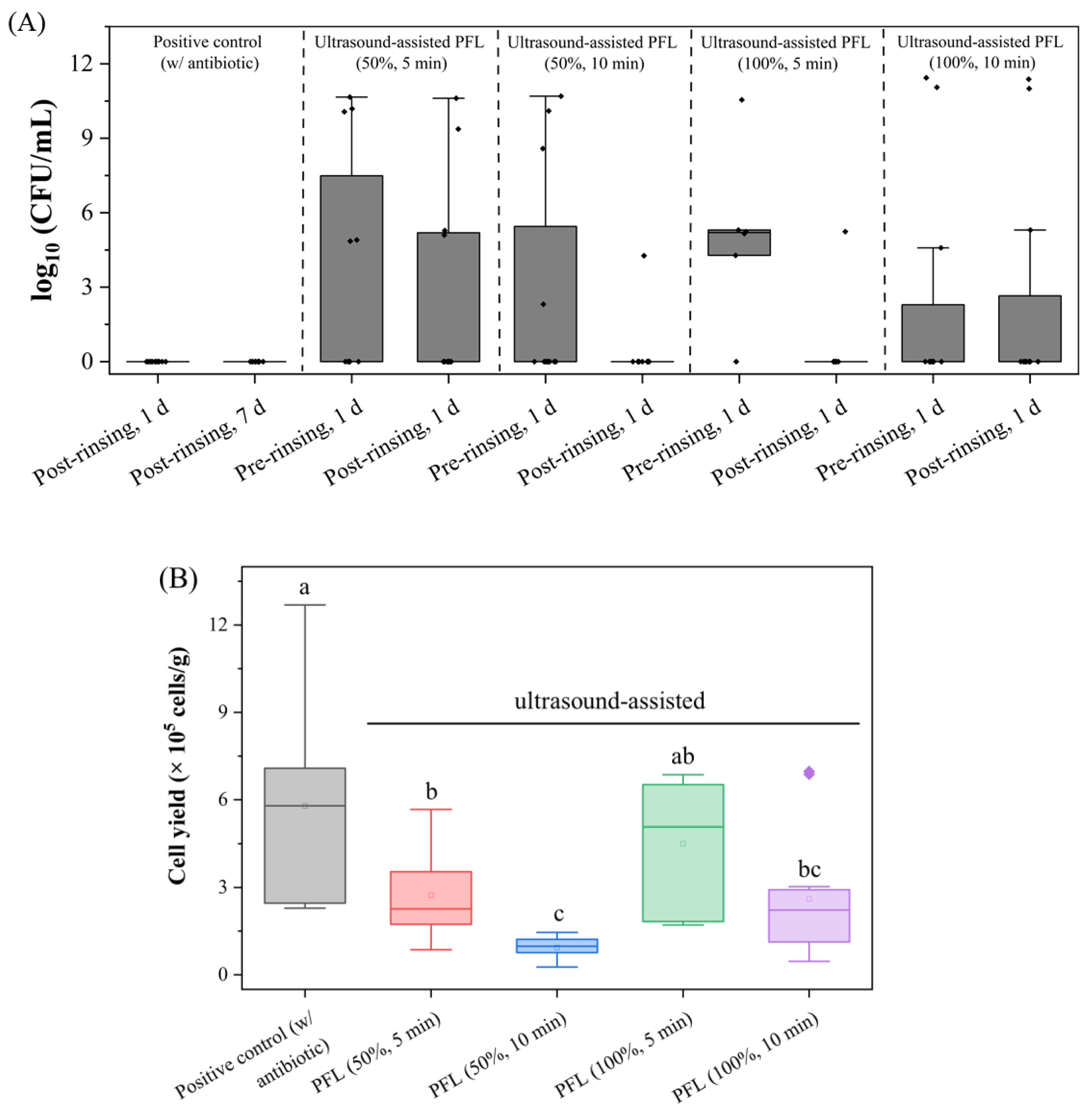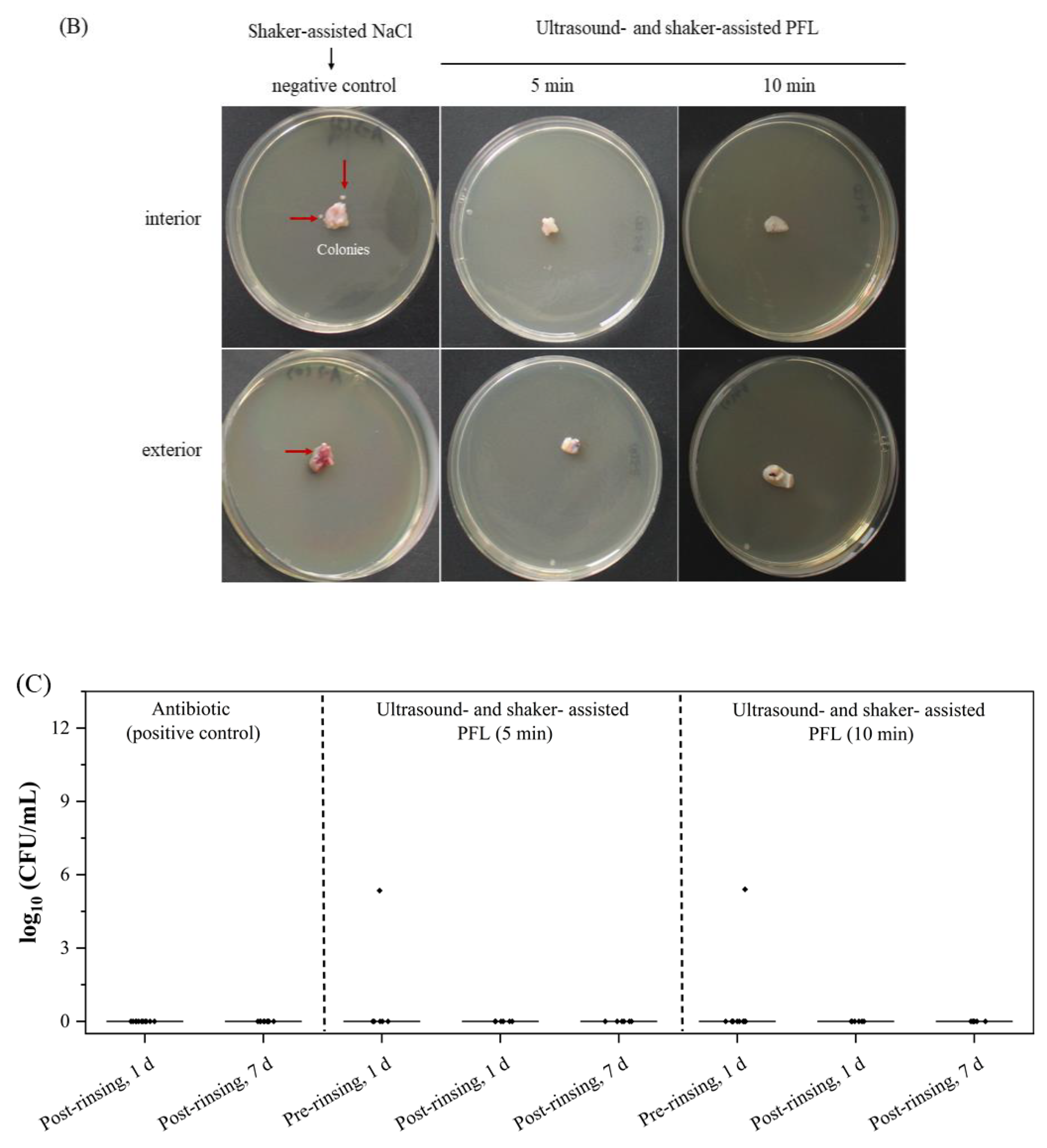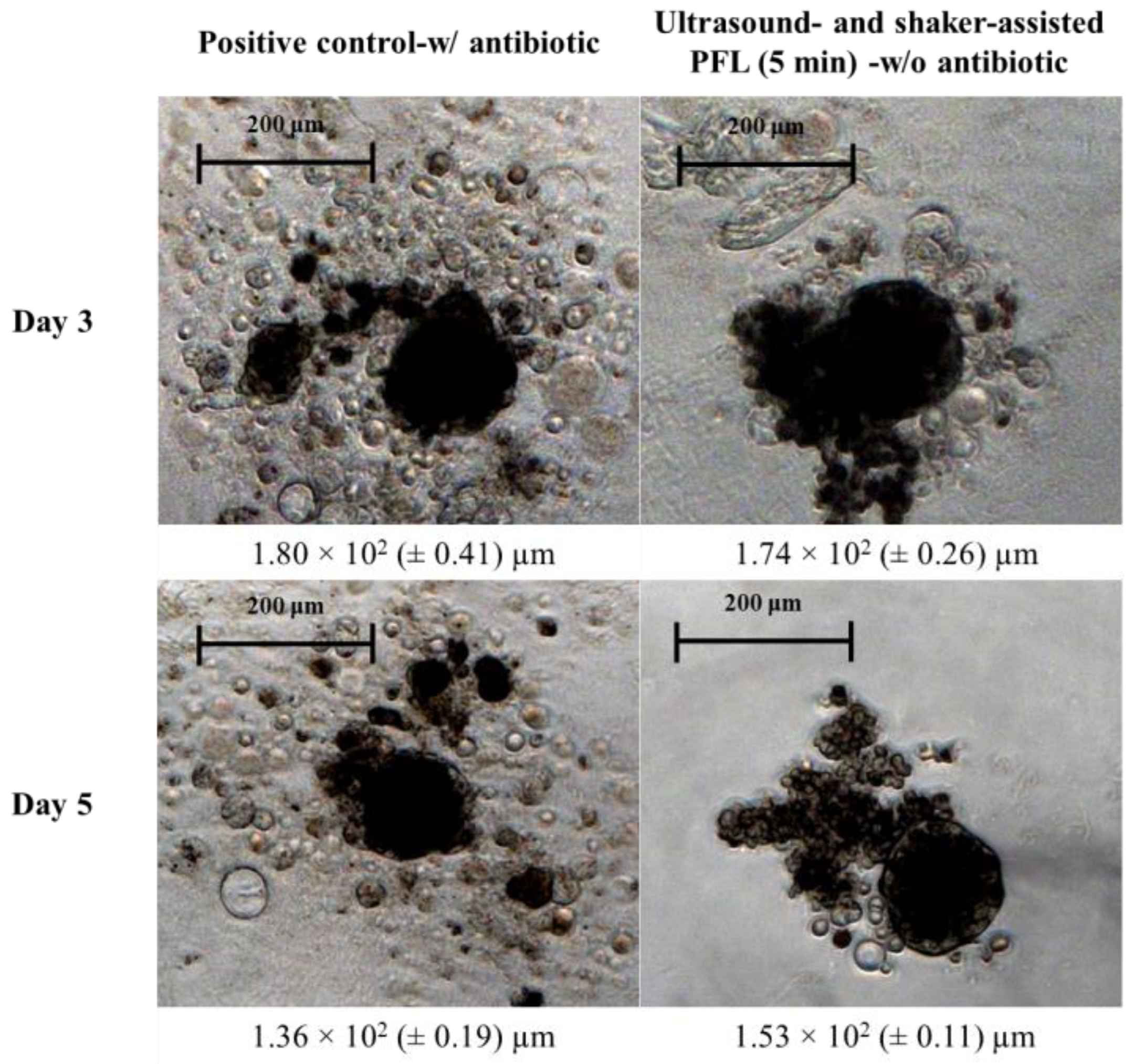 3.3. Ultrasound-Assisted PFL Rinsing Eliminates Bacterial Contamination but Yields Low Cell Numbers
