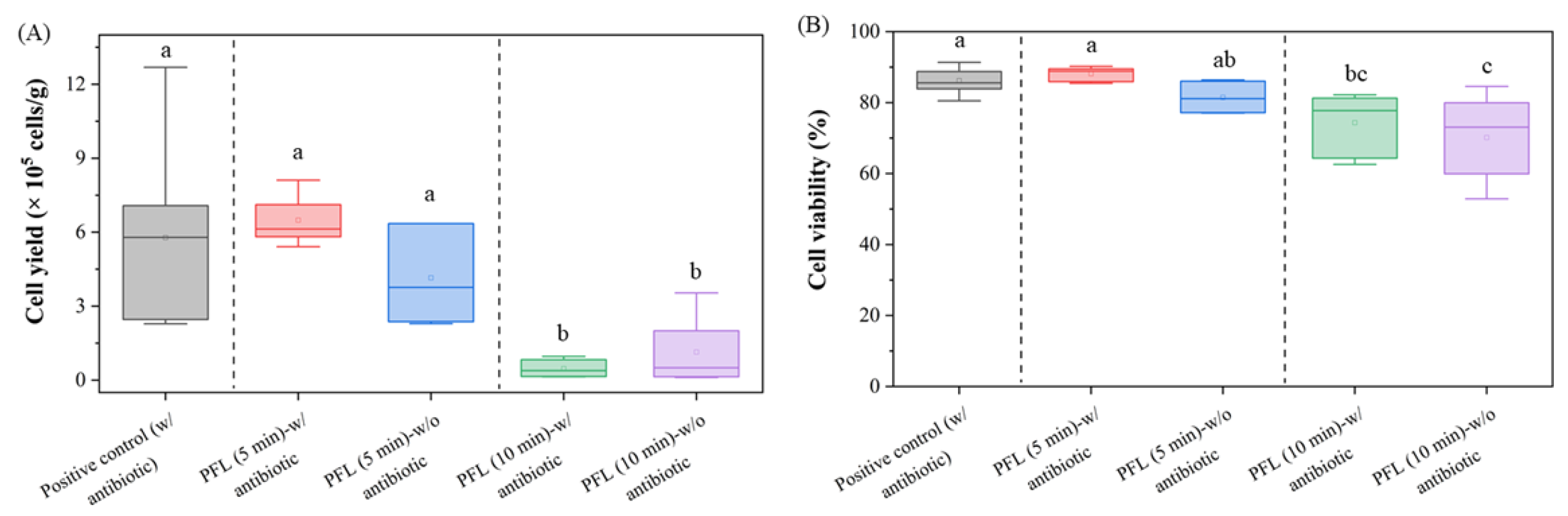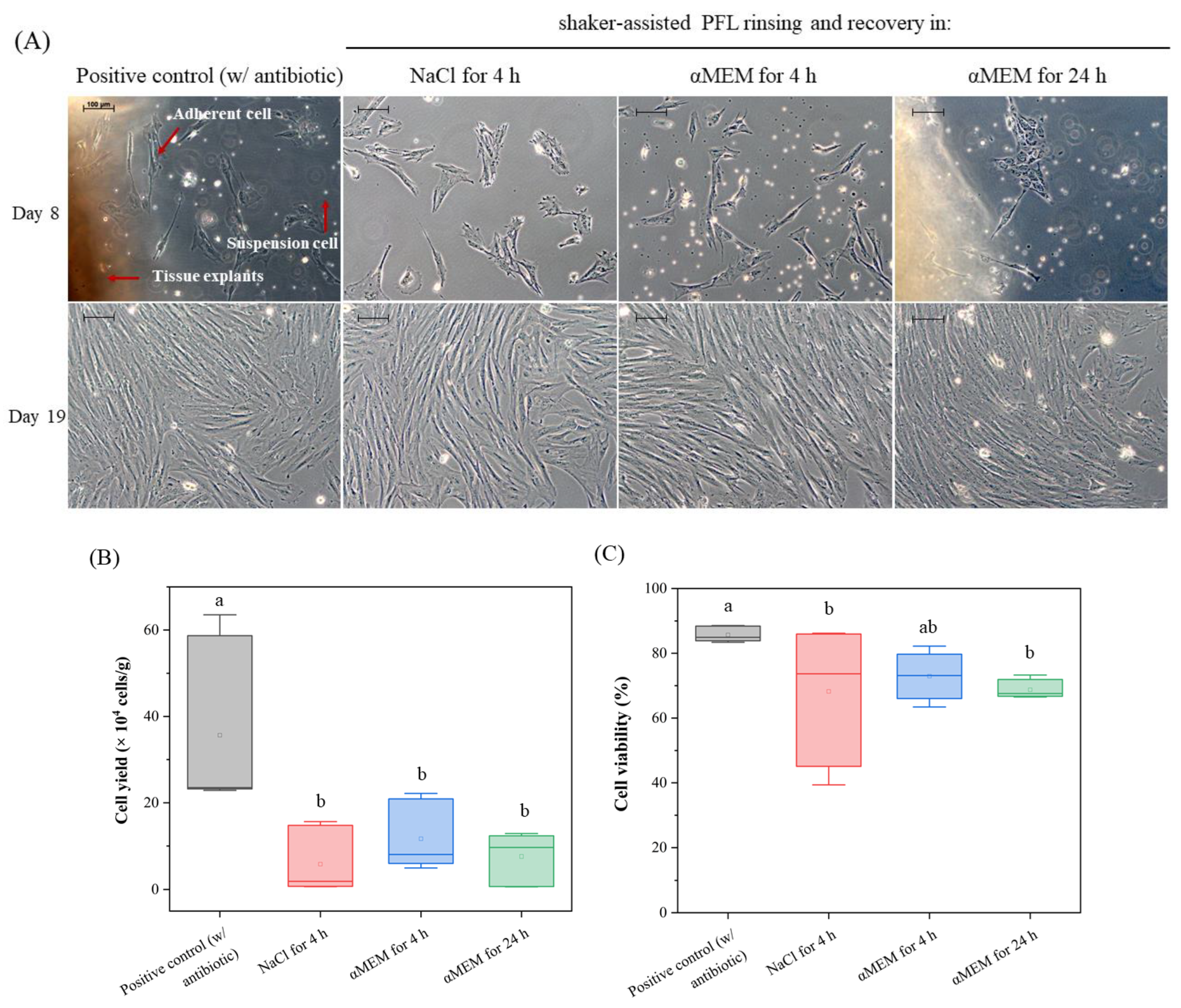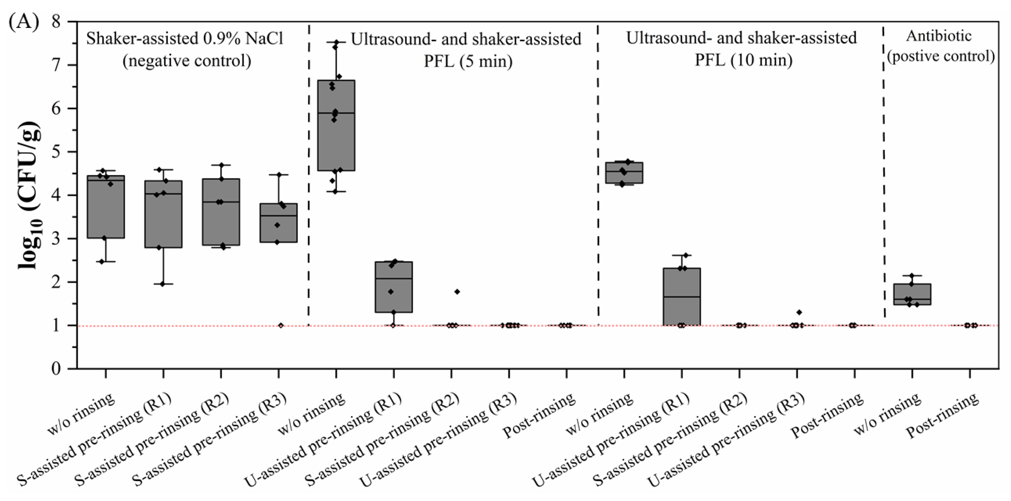 3.3. Ultrasound-Assisted PFL Rinsing Eliminates Bacterial Contamination but Yields Low Cell Numbers