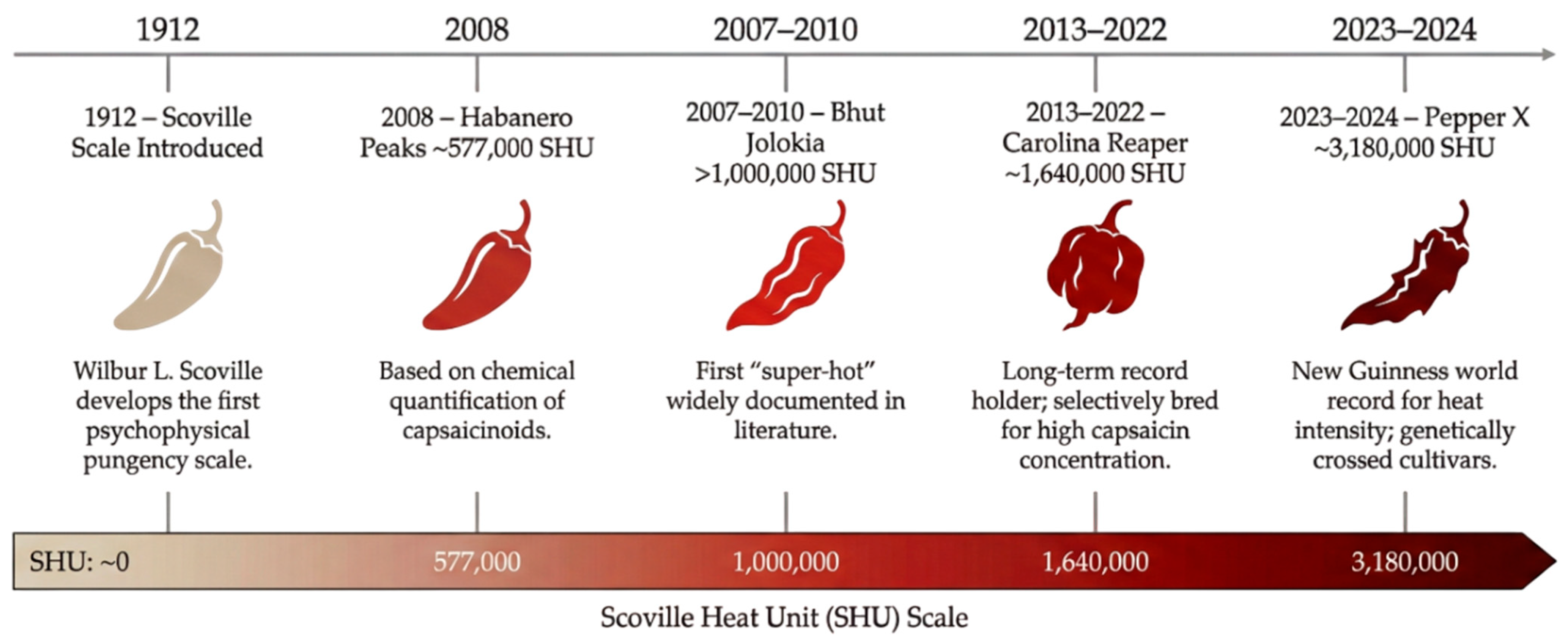 2.2. Evolution of Chili Pepper Spiciness: Measurement, Mechanisms, and Cultural Adaptation
