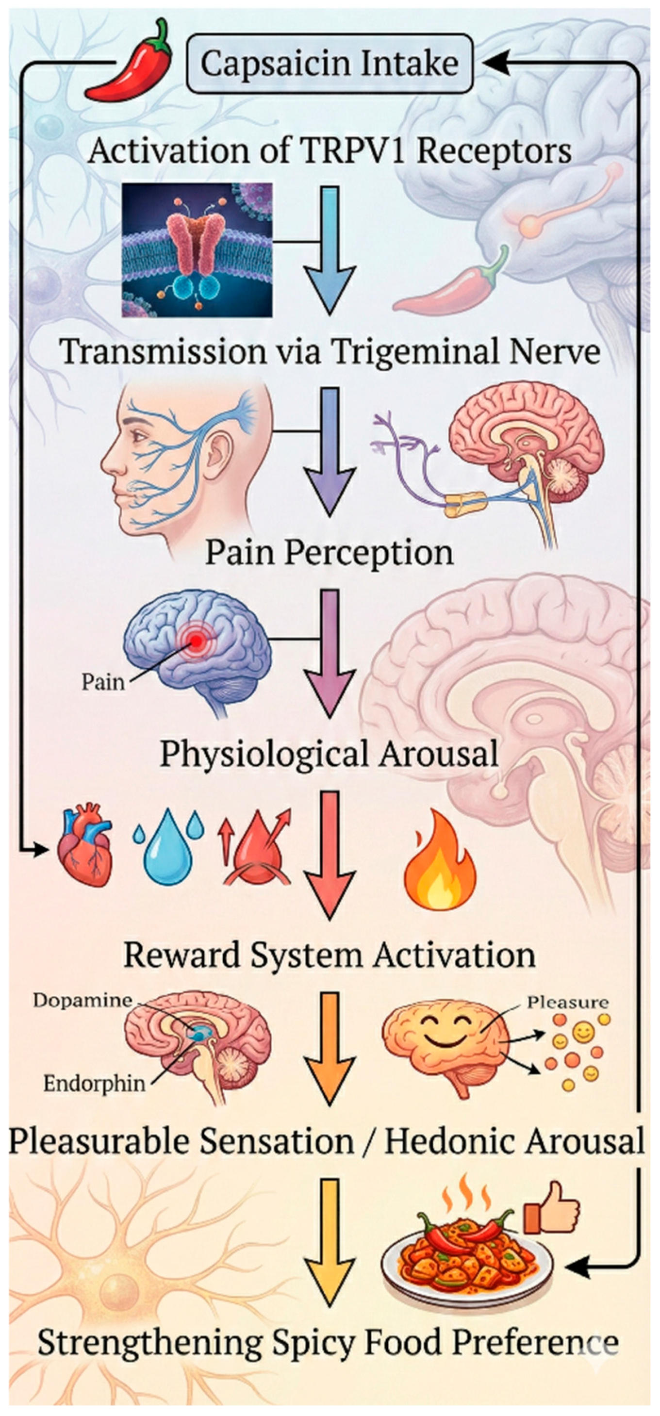| Biological (Neuro) | Trigeminal-reward linkage | Physiological arousal from pungency links to reward responses | Trigeminal afferents- dopaminergic system | [27,36,119] |