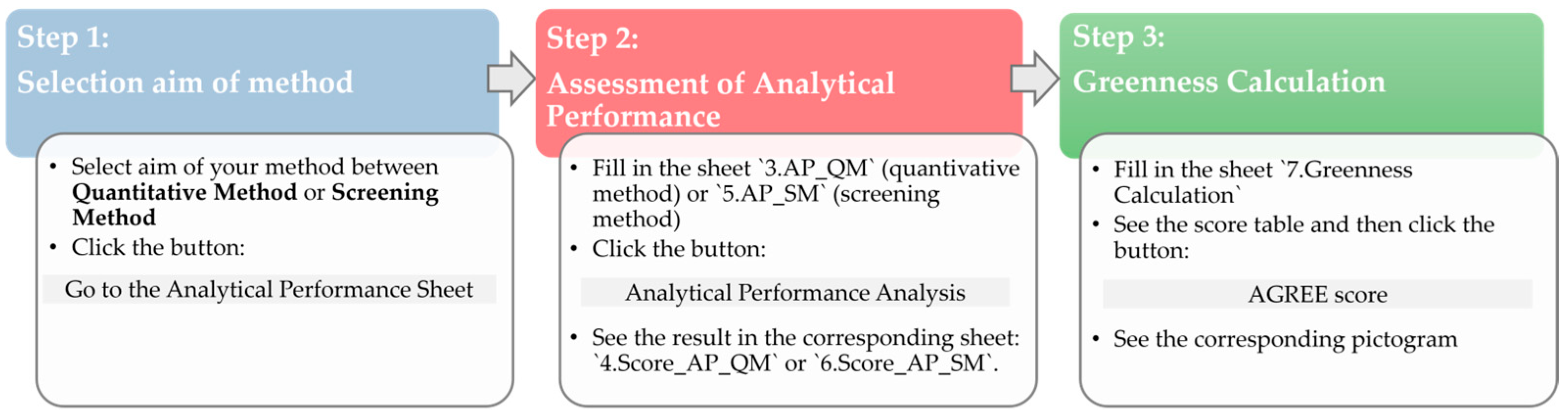 Figure 1: powder blue for step 1 “Selection aim of method”, pinkish light red for the step 2, “Assessment of analytical performance”, and green for step 3, “Greenness calculation”. Each step corresponds to a group of sheets identified by the same color code.
