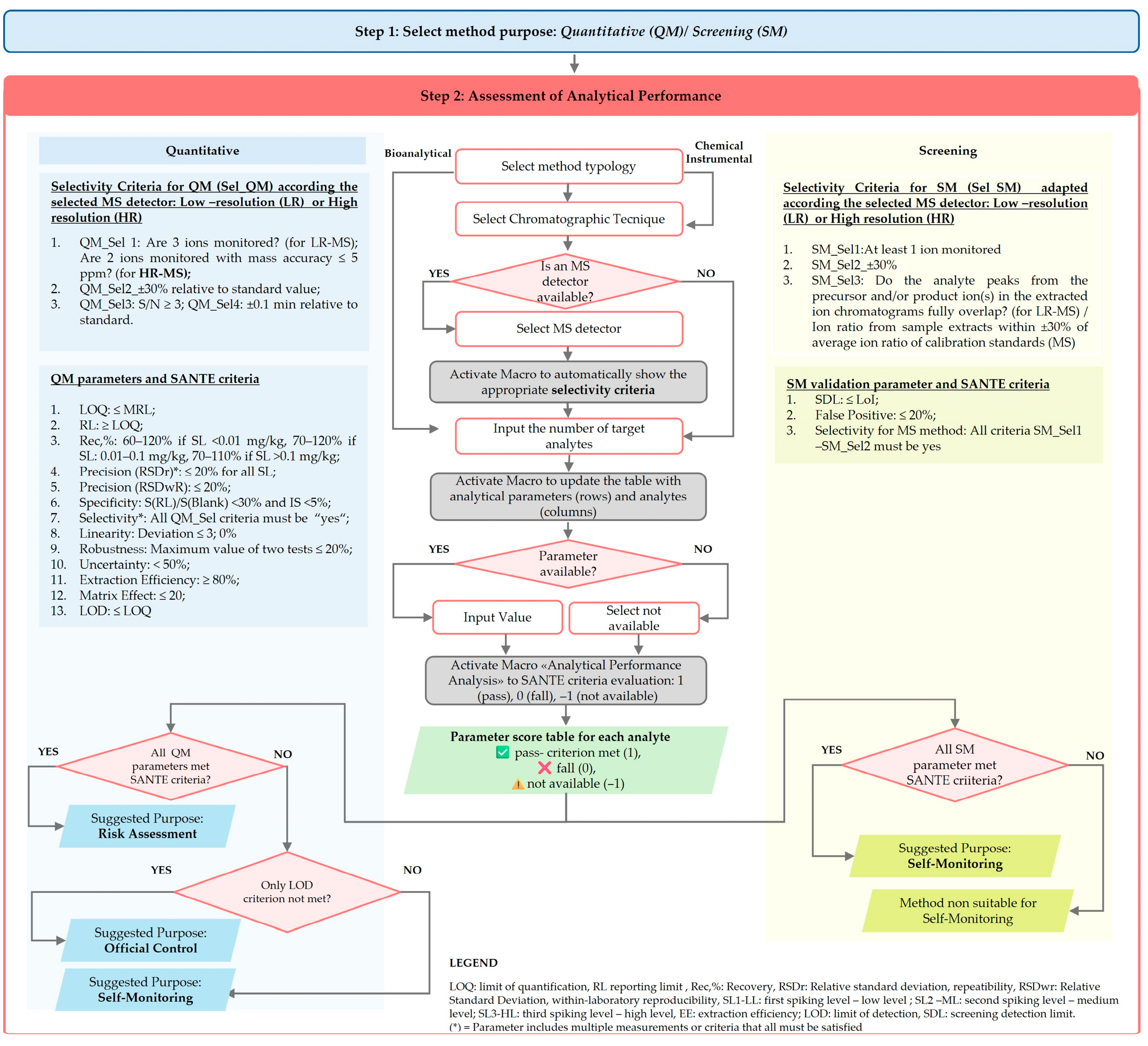 Figure 3 presents a detailed flowchart of the first two steps illustrating all decision points and the threshold values applied to each parameter (based on SANTE criteria).