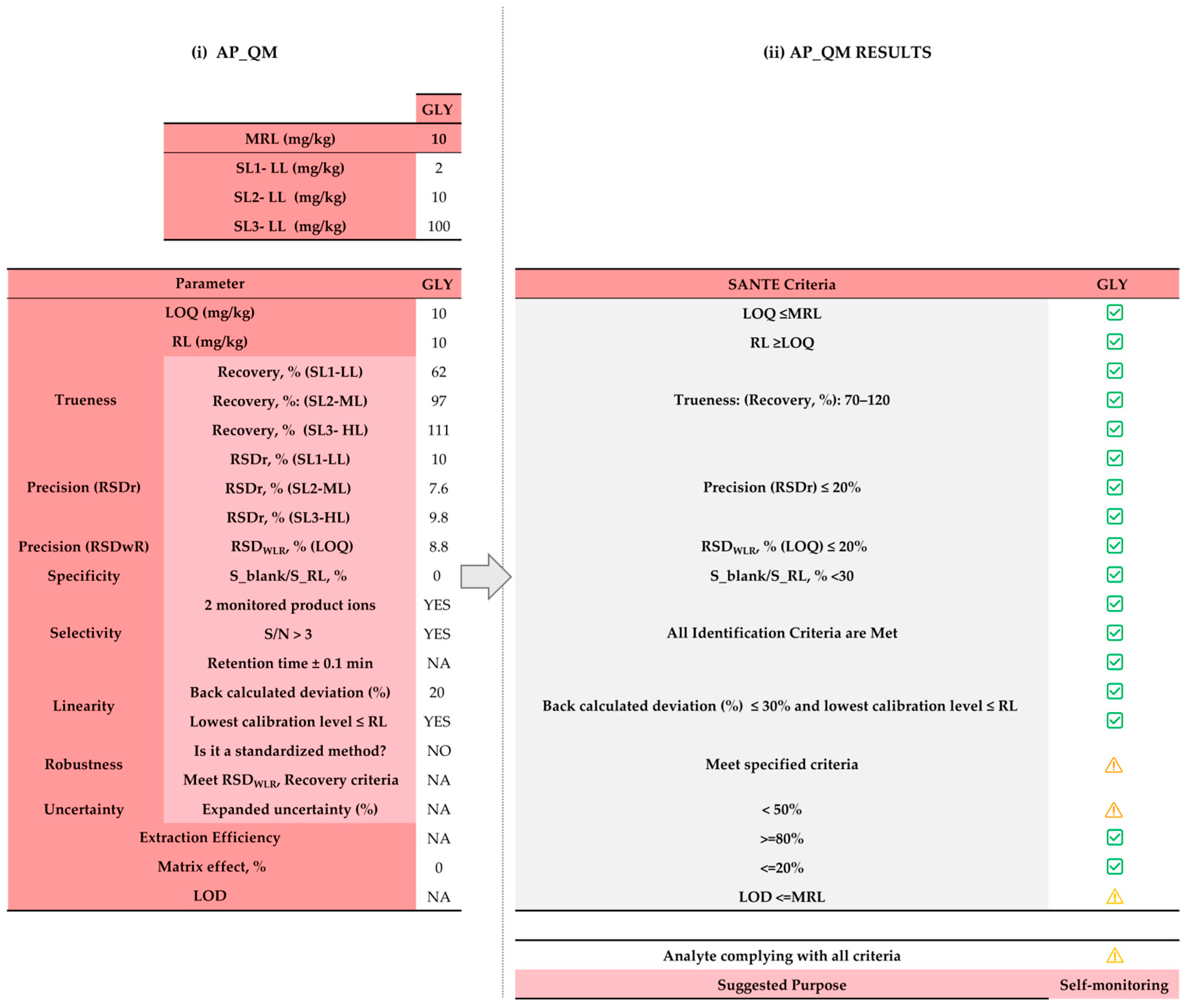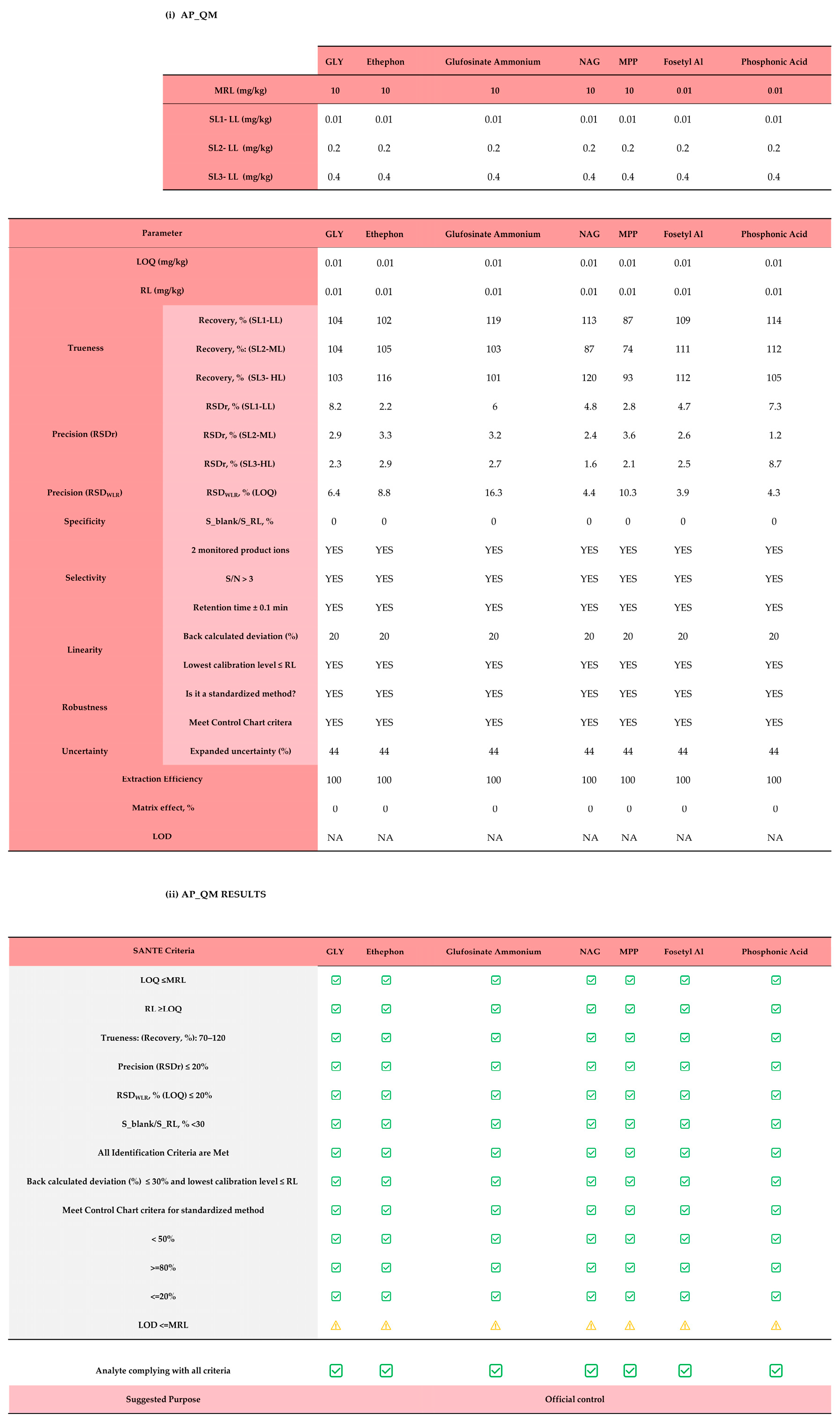 ) highlights parameters that are missing or not evaluable. The same symbols were used in correspondence to the row labeled “Analyte complying with all criteria” to summarize the overall performance of each analyte. If all parameters meet the SANTE criteria, the tool suggests the quantitative method as suitable for risk assessment. If all parameters are met except for the LOD, the quantitative method is considered suitable for official control. Otherwise, the method is recommended for self-monitoring only.