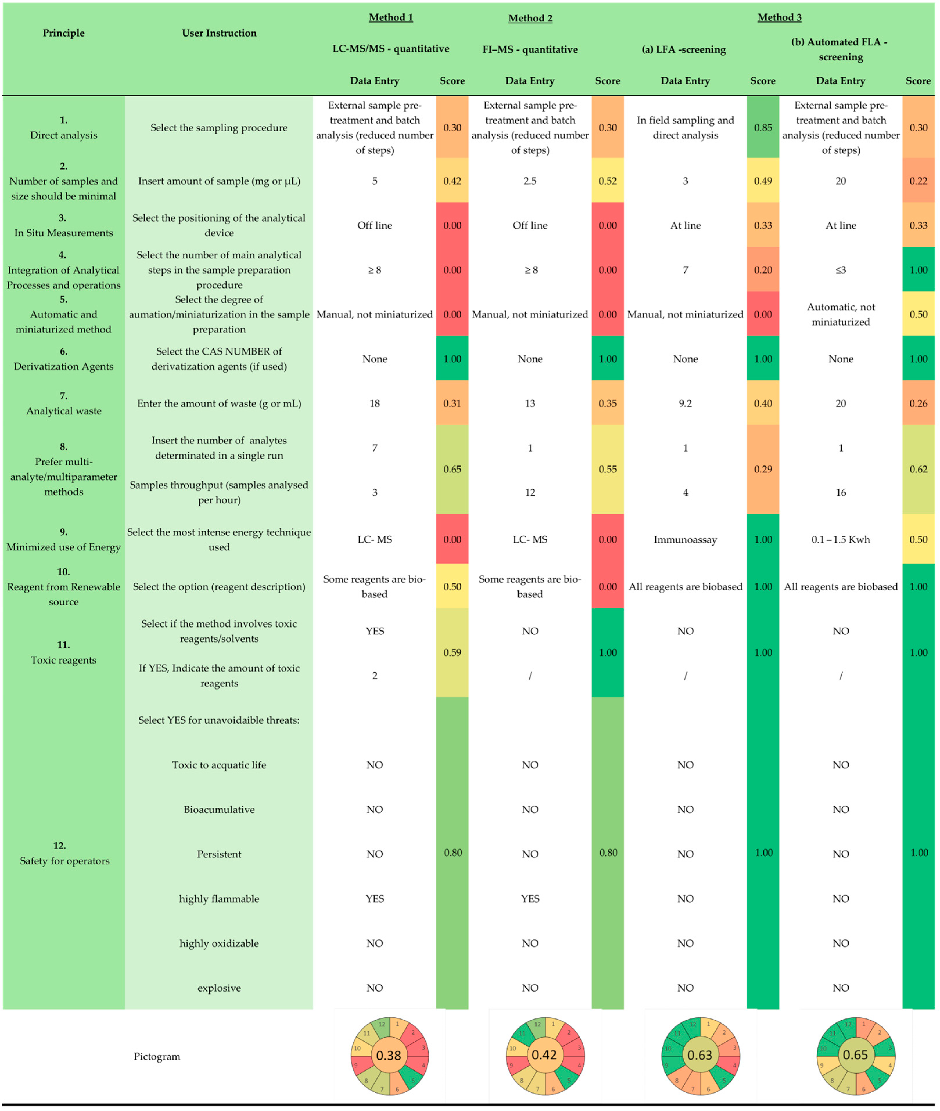 29]. For each principle, the user selects the option that best describes the method. The AGREE score is then automatically calculated for each principle. Moreover, a color-coded pictogram will be shown by clicking the “Analysis of GREEnness Performance” button.