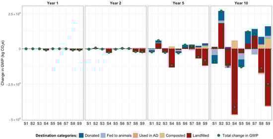 Calculated life cycle GWP for fresh produce redistributed in the New York Capital Region. These factors considered agricultural production [75,76,77,78,79,80], retailing [81], transportation [27,82], and waste management options: animal feed [72,83], composting [84], anaerobic digestion [85], and landfilling [86]. GWP life cycle impact factors (GWP.IFs) for each fresh produce category destination were calculated based on donation sources (farm and retail) and destination (e.g., donation, composting, landfill). Due to the lack of available data, GWP.IFdonation excludes transportation from food pantries to households. GWP.IFanimal feed accounts for avoided emissions from substituting corn in feed, using a 7:1 waste replacement ratio [72] and irrigated corn production [83]. GWP.IFAD considers avoided emissions from the process [85], utilizing food waste for natural gas and electricity generation [87]. We used the value for food waste to anaerobic digestion with biogas used for electricity generation. GWP.IFcomposting reflects the composting process [84]. GWP.IFlandfill includes emissions from produce landfilling based on the WARM model v.16 [86], accounting for energy recovery from operational landfill gas-to-energy projects in New York State [88], where most facilities convert waste to electricity, although the specific energy recovery method for several facilities is unknown. Calculations of GWP.IFs are provided in the technical appendix (Supplementary File S1, Table S7).
