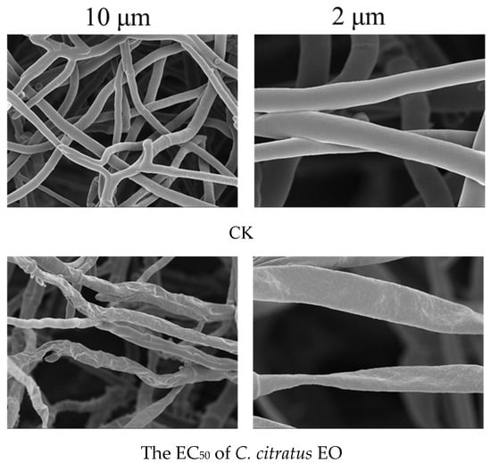 SEM images revealing ultrastructural damage to B. cinerea hyphae after 3 days of exposure to the EC50 concentration of C. citratus EO vapor.