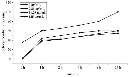 B. cinerea mycelium cultured in PDB for 4 days was rinsed thrice with distilled water, blotted dry with filter paper, and 1 g (fresh weight) was transferred to 50 mL flasks containing 20 mL distilled water (control) or solutions containing EO (7.81, 31.25, 125 µg/mL) or individual compounds (citronellal: 1.96, 7.81, 31.25 µg/mL; nerol: 7.81, 31.25, 125 µg/mL). Samples were incubated at 26 ± 1 °C in a shaking incubator (120 rpm). Electrical conductivity was measured at 0, 1, 2, 4, 8, and 24 h using a conductivity meter to assess cell membrane permeability. The percentage of electrolyte leakage was calculated relative to the total conductivity after boiling the samples. Each treatment was performed in triplicate.