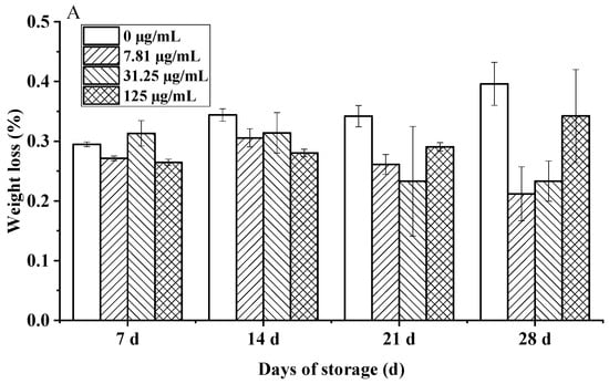 Concurrently, EO fumigation significantly suppressed decay in a dose-dependent manner (Figure 10B). While the control reached 39.39% decay by day 28, EO treatments (7.81–125 µg/mL) reduced rates to 22.72–37.72% (p < 0.01), with the highest dose (125 µg/mL) completely inhibiting decay until day 21 and maintaining only 1.67% incidence at day 28. This potent antifungal activity, correlating with the volatile composition’s ability to disrupt fungal membrane integrity and spore germination [46], demonstrates competitive efficacy (86.7% reduction vs. control at 125 µg/mL) to synthetic fungicides without residue concerns [47].