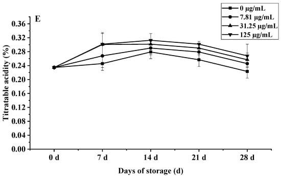Furthermore, firmness retention significantly improved under high-dose EO (125 µg/mL) by day 28 (1.97 × 105 Pa vs. control 1.70 × 105 Pa, p < 0.01), representing a 15.9% advantage (Figure 10C), likely due to citronellal-mediated suppression of cell wall hydrolases (PG, β-Gal) [48]. This preserved firmness exceeds relevant EU quality standards [49].