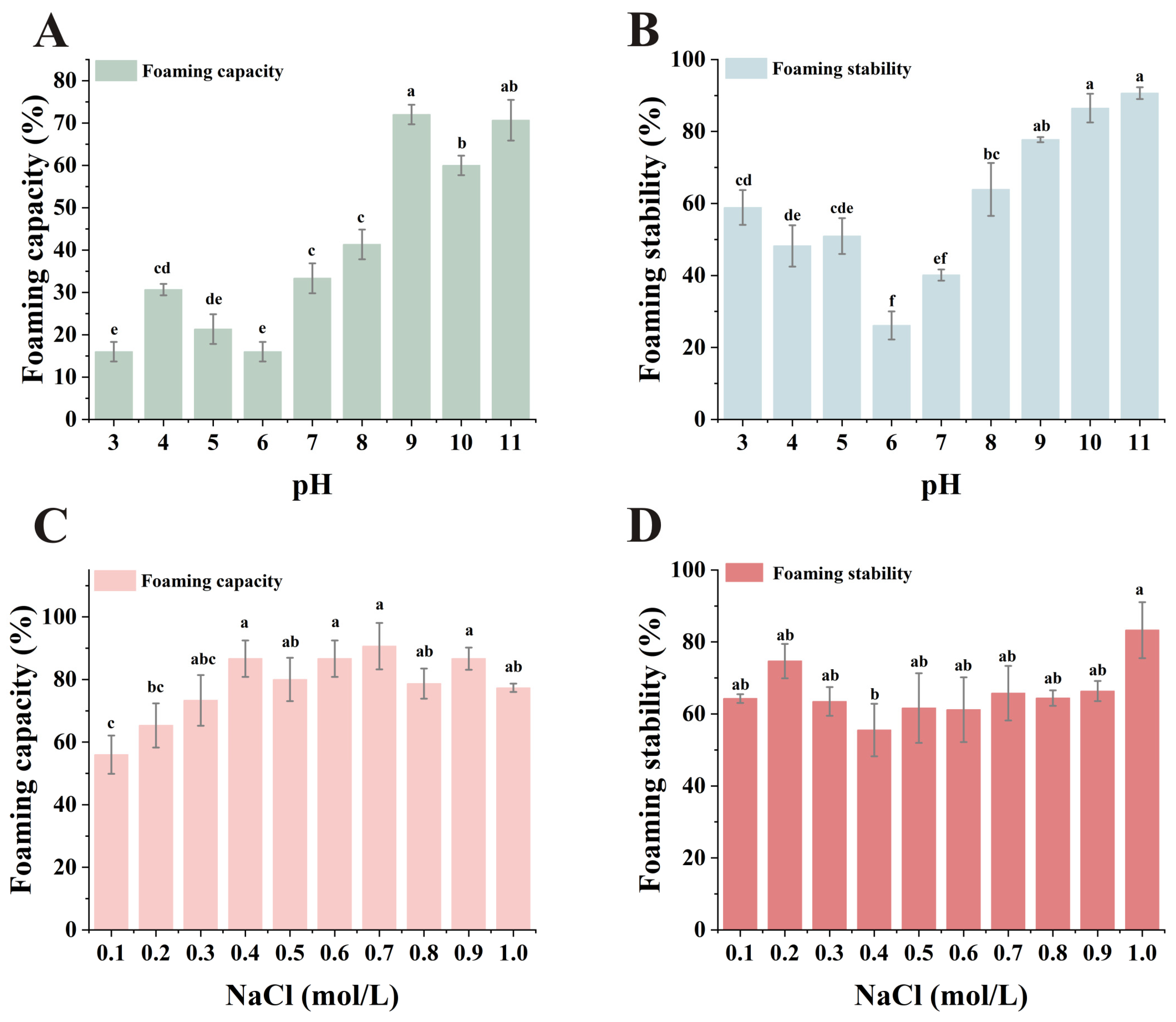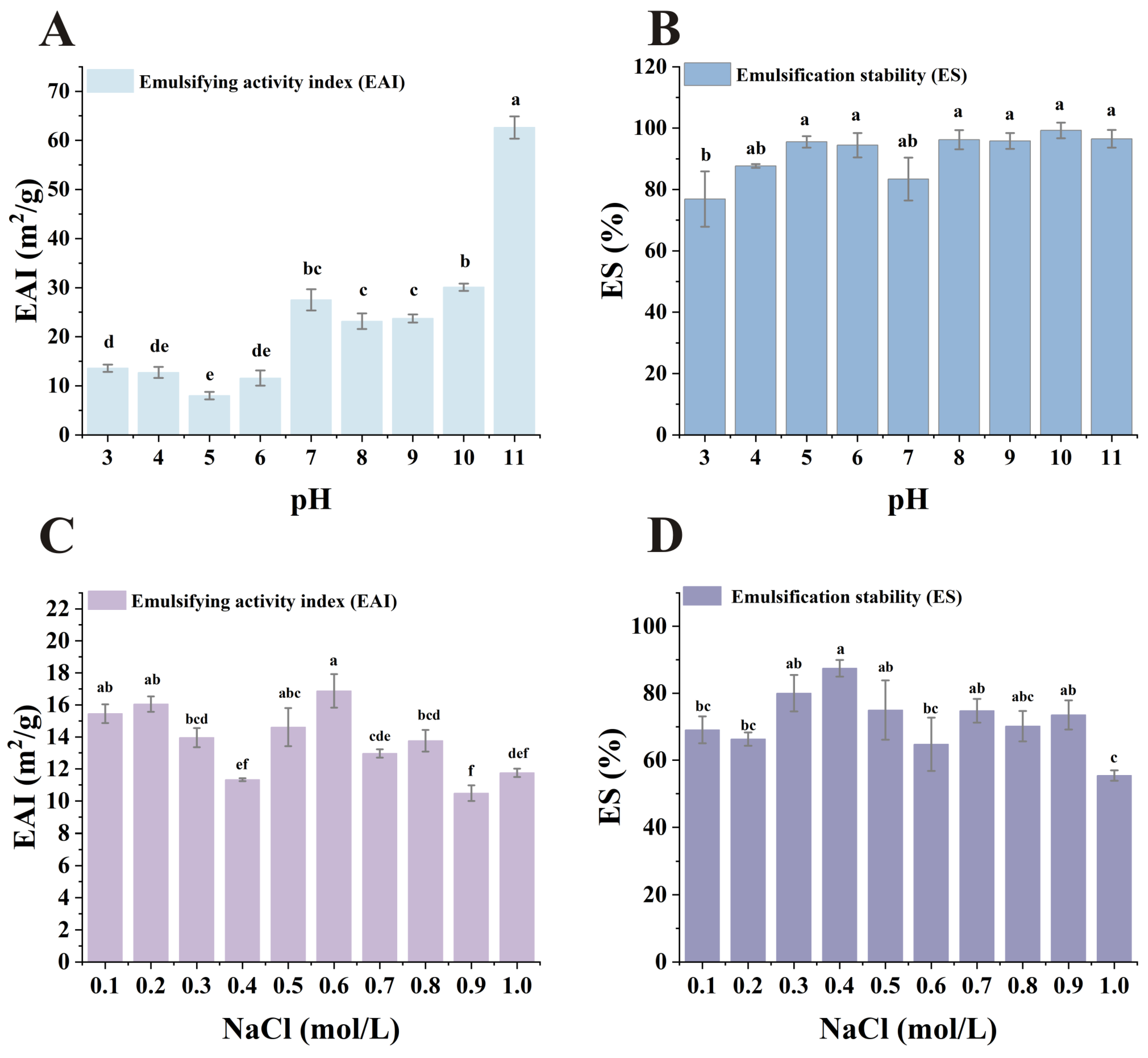 2.9. Effect of pH Value and Salt Ion Concentration on Emulsification Properties