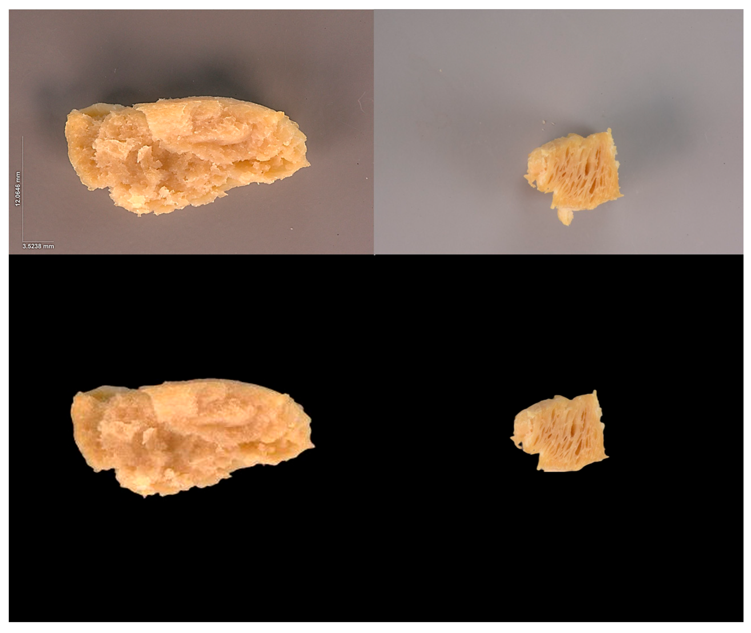 To analyze the internal structure of the extruded textured vegetable protein (TVP) products, high-resolution macro images were captured using a Nikon D750 digital camera equipped with a 105 mm macro lens and SB-R200 wireless remote flash (Tokyo, Japan). The imaging setup included a Kaiser Copy Stand RS1, two Dracast Camlux Pro LED light panels, and an 18% grey card as the background to ensure standardized lighting and color balance. Image acquisition was conducted using CaptureOne software (version 10.1.1.5, Phase One, Copenhagen, Denmark).
