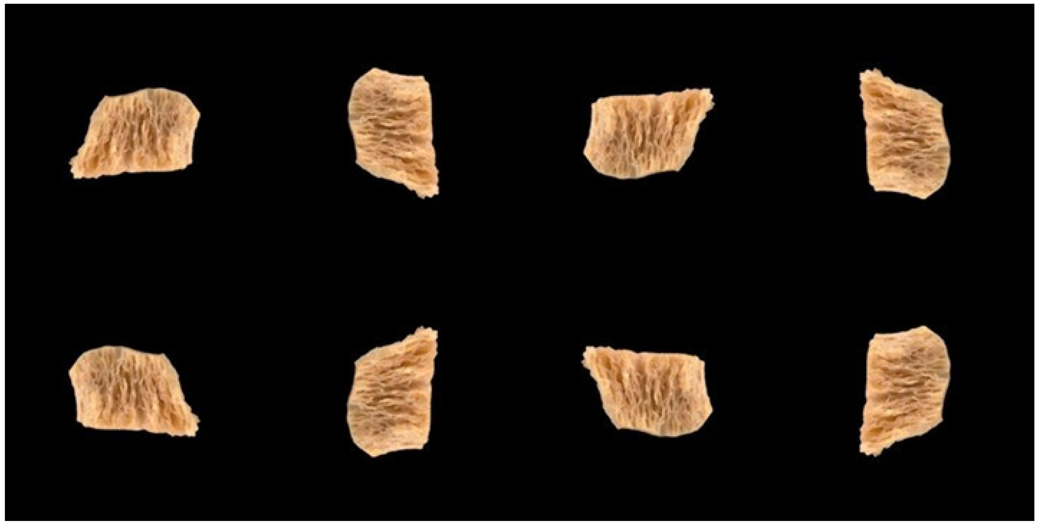 Prior to imaging, dried TVP samples were rehydrated in tap water for 30 min and then drained for a duration of five minutes. Out of a total of 63 TVP samples that were collected, 18 hydrated pieces were sliced both longitudinally and transversely (relative to the direction of extrusion) in order to expose internal structural features. This procedure, which allowed for the visual inspection of cross-linking and layering densities in different directions, was used to capture 36 images for subsequent analysis. The remaining TVP samples were horizontally sliced, thus providing 45 additional time-series image samples. A total of raw images were acquired in this manner.