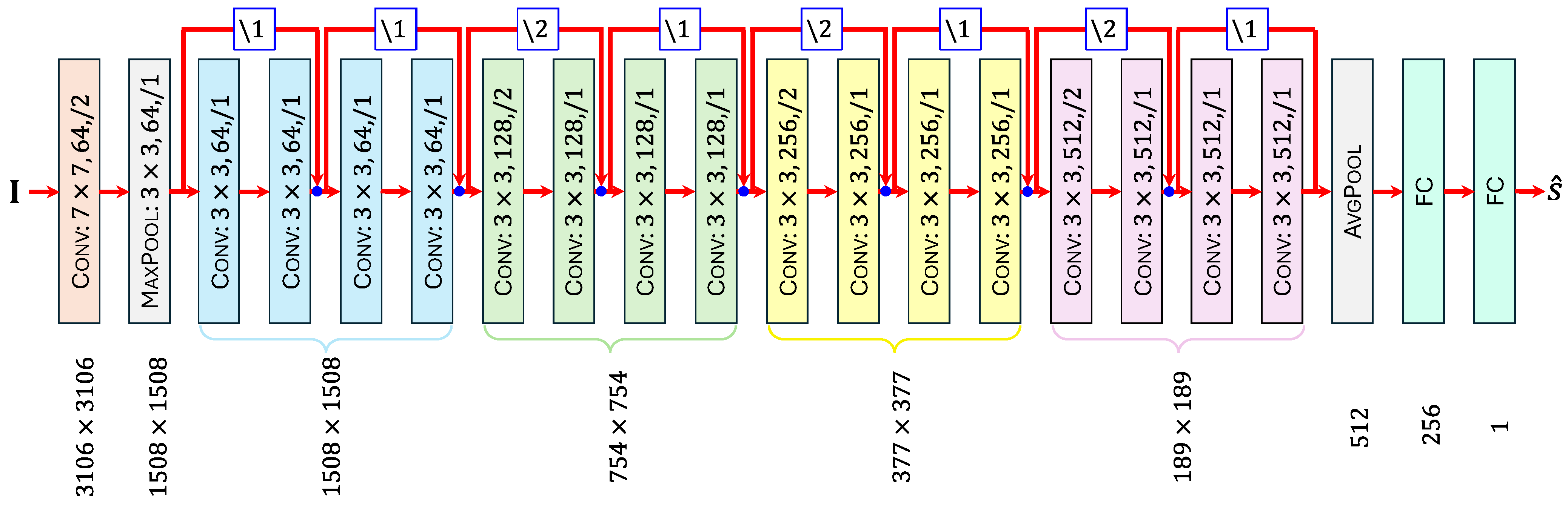 The DNN’s input image undergoes several layers of image processing. After the initial Conv layer and MAXPOOL layer, downstream image processing layers are grouped into four blocks, and each such block comprises four Conv layers with identical output sizes. The layers in each block are shown as rectangles with the same color. All connections are shown as red arrows. The strides of residual connections (Equation (8)) are provided in the format and enclosed within small blue squares. The pixelwise additions involved in Equations (9) and (10) are depicted as blue dots.
