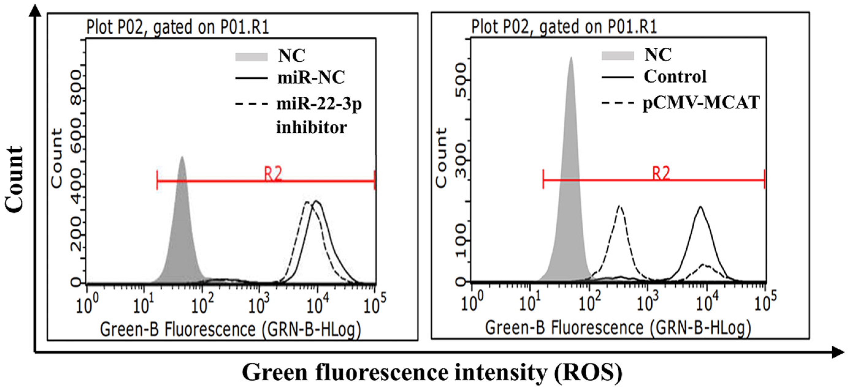 For MCAT knockdown, LO2 cells were seeded in 12-well plates. At 60–70% conflu-ency, cells were transfected with 50 nM of either negative control siRNA (siCtrl) or MCAT-specific siRNA (siMCAT; SMARTpool: ON-TARGETplus Human MCAT siRNA, Dharmacon, Lafayette, CO, USA) using Lipofectamine RNAiMAX (Invitrogen), following the manufacturer’s instructions. After 6 h, the medium was replaced with fresh complete medium. For the rescue experiment, a concentration of 20 μM curcumin was selected based on our dose–response results, which demonstrated that this concentration effectively downregulated miR-22-3p and upregulated MCAT mRNA expression. 24 h after siRNA transfection, 20 μM curcumin or an equal volume of solvent (DMSO, vehicle control) was added to the designated wells. Following an additional 24 h of incubation, cells were harvested for RNA extraction or ROS measurement. Knockdown efficiency was verified by qRT-PCR (see