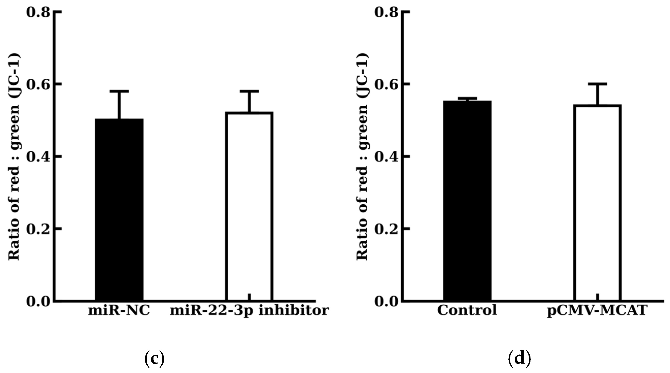 4 cells per well and grown for 24 h to 70–80% confluency. Prior to transfection, a DNA-miRNA mixture containing 0.2 μg of reporter plasmid (WT or MUT psiCHECK2-MCAT-3′UTR) and 40 nM of miR-22-3p mimic (or NC mimic; RiboBio) was prepared per well. This mixture was combined with Lipofectamine 2000 (Thermo Fisher Scientific, Waltham, MA, USA) at a 1:2 ratio in Opti-MEM, incubated for 20 min at room temperature to form complexes, and then applied to the cells. Subsequently, 48 h post-transfection, cells were lysed and luciferase activity was measured sequentially (Firefly, then Renilla after quenching) using the Dual-Luciferase Reporter Assay System (Cat# E1910, Promega, Madison, WI, USA) [