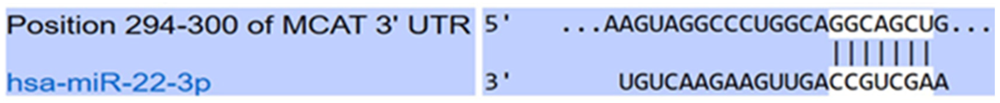 MCAT-3′-UTR MUT Reverse: 5′-GCCTGCCAGGGCCTACTTCGAAAGTTTGGG-3′,