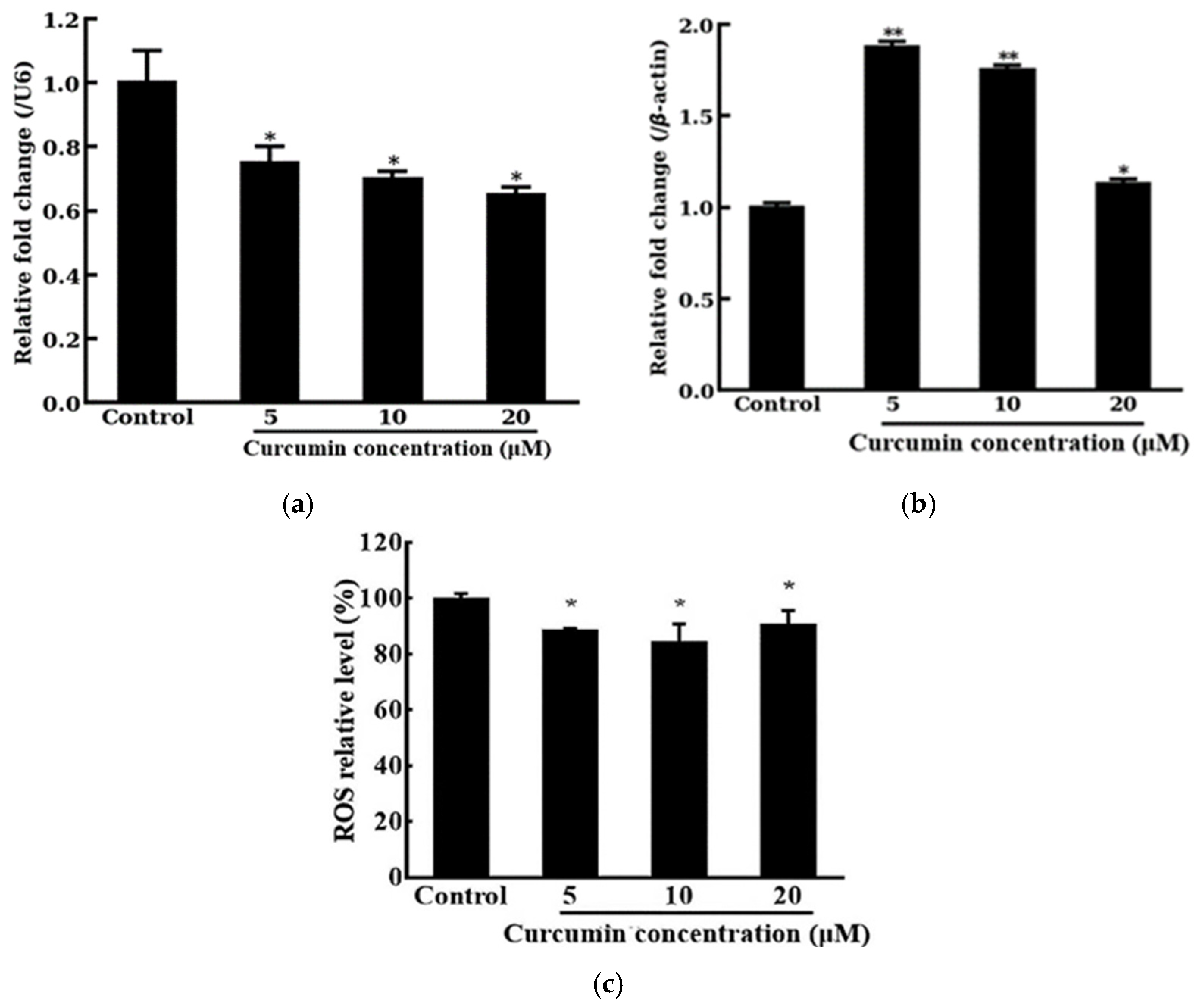 Collectively, these data define a curcumin–miR-22-3p–MCAT axis that enhances mitochondrial antioxidant defense and bioenergetics. Key supporting evidence includes a reduction in mitochondrial ROS, an increase in the cellular ADP/ATP ratio (consistent with enhanced oxidative phosphorylation in the context of a stable membrane potential ΔΨm), and an elevation in cellular reducing capacity. The curcumin concentrations employed (5–20 μM) are within the standard, biologically effective range for in vitro mechanistic studies [